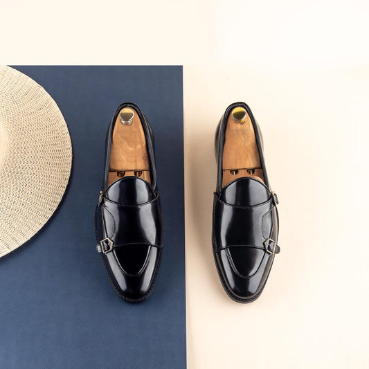 Tangerine Brushed Black Belgian Batwing Double Strap Monk Shoes For Men