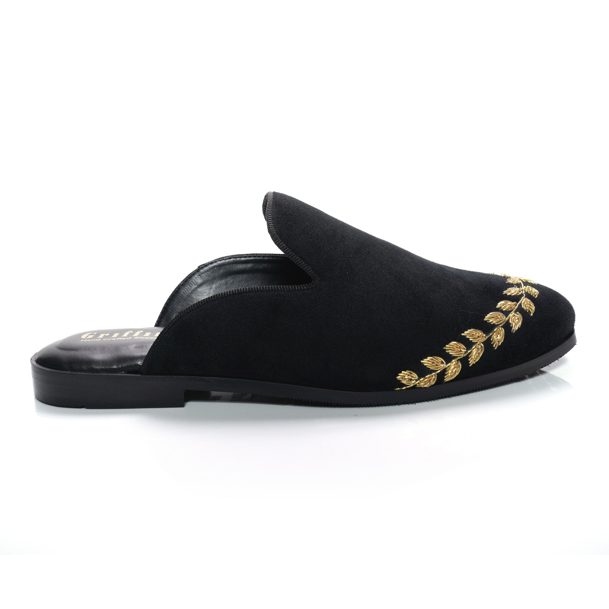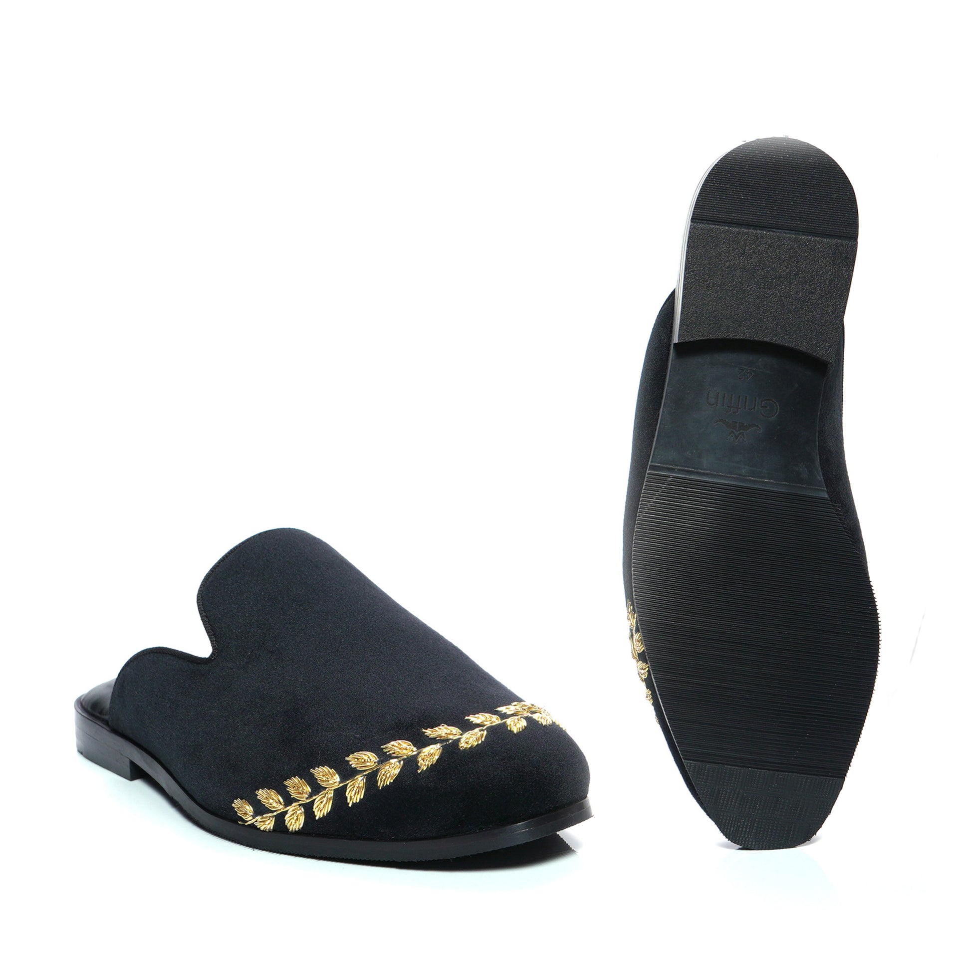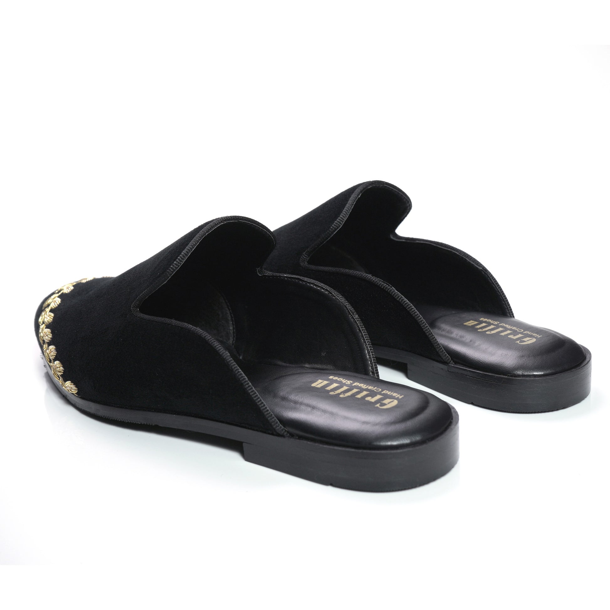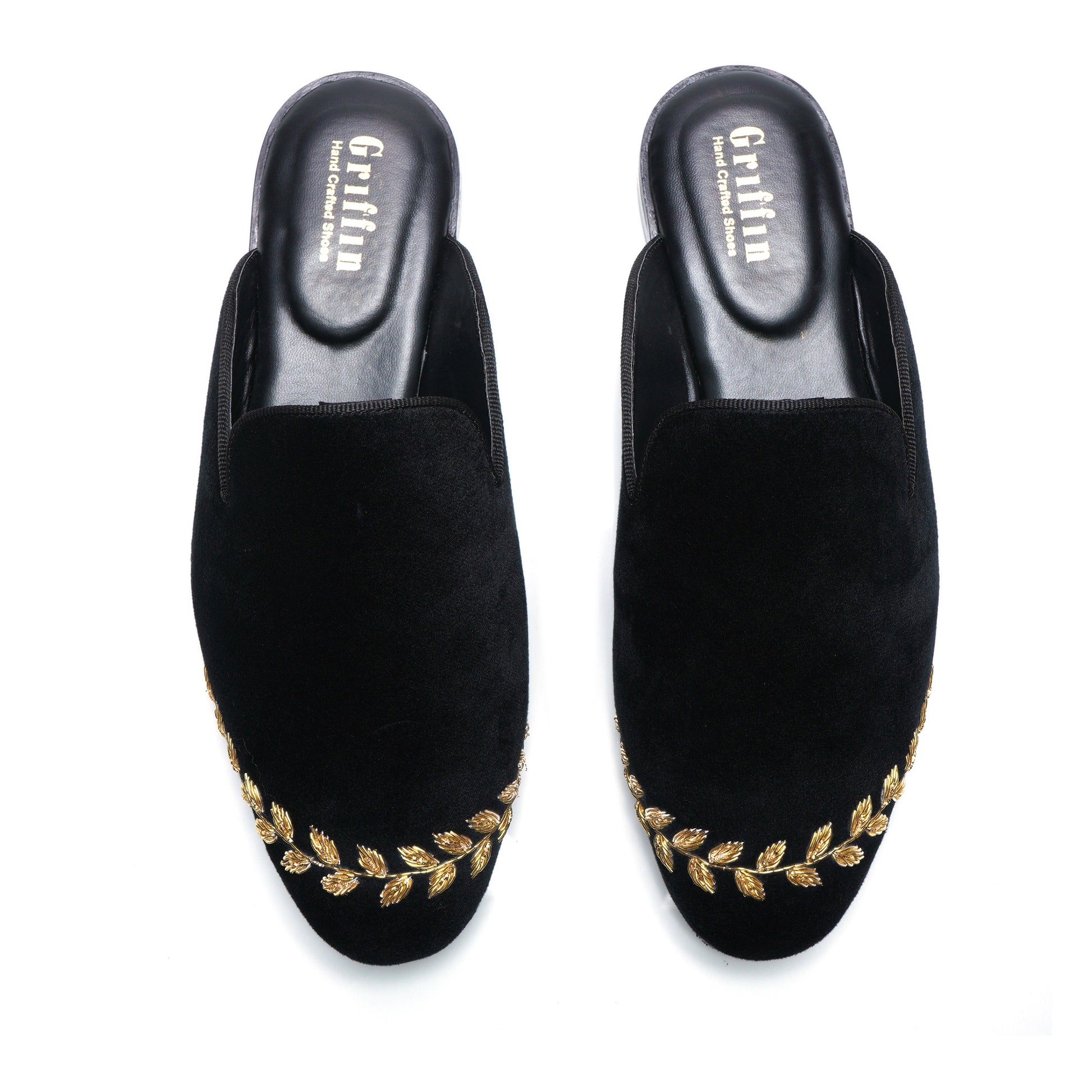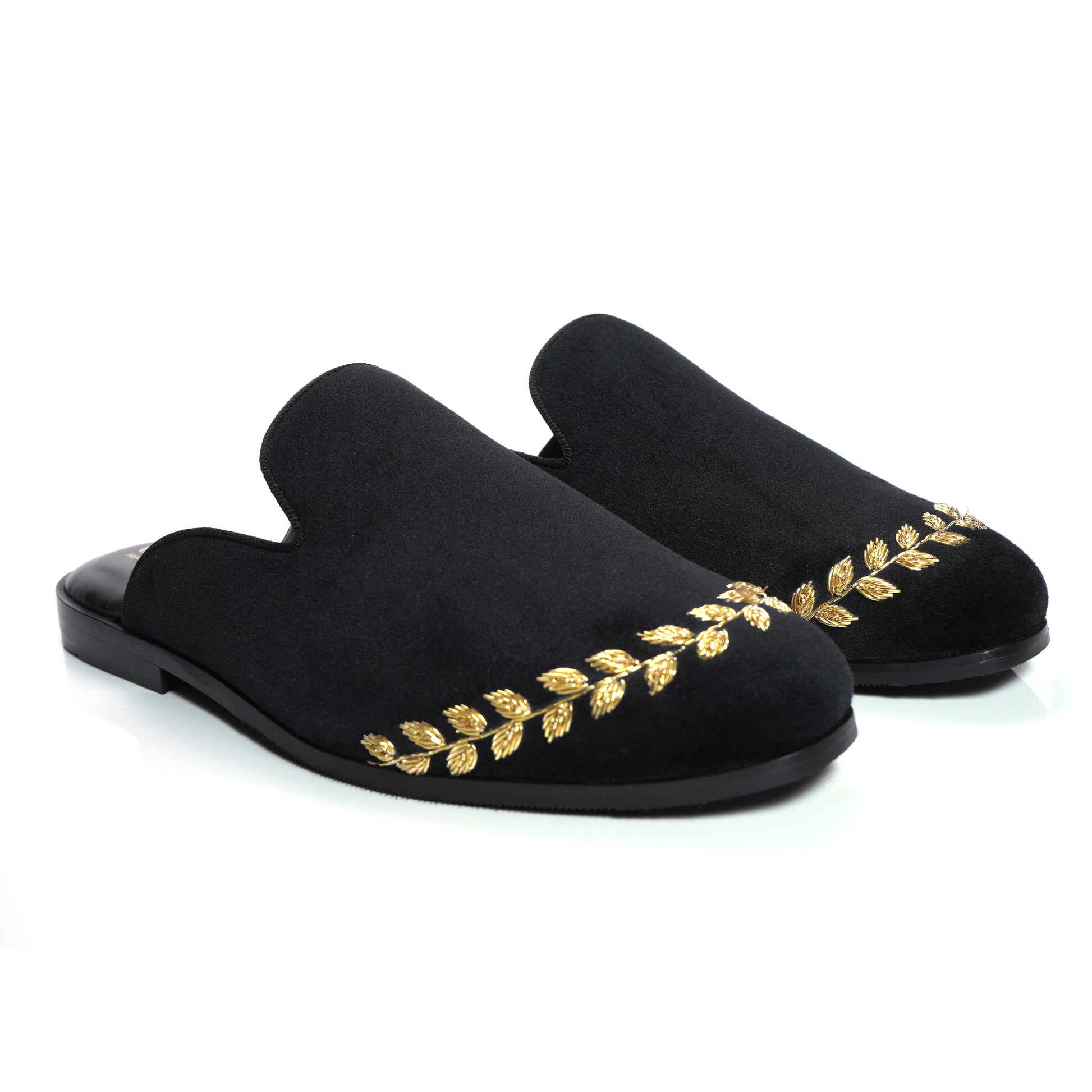 - The gold zardozi work transitions to a beautiful black gold tone throughout the body of the shoe.