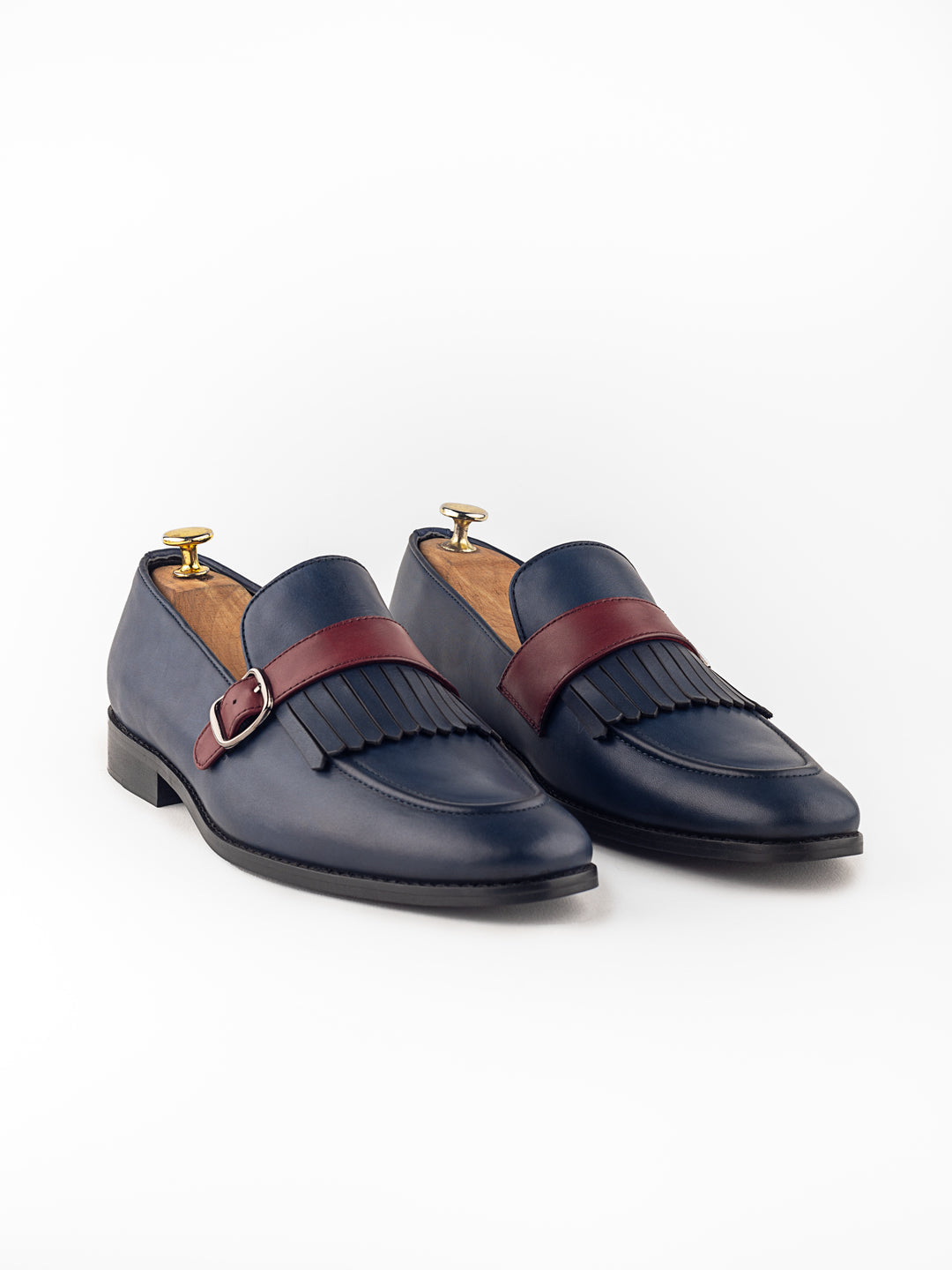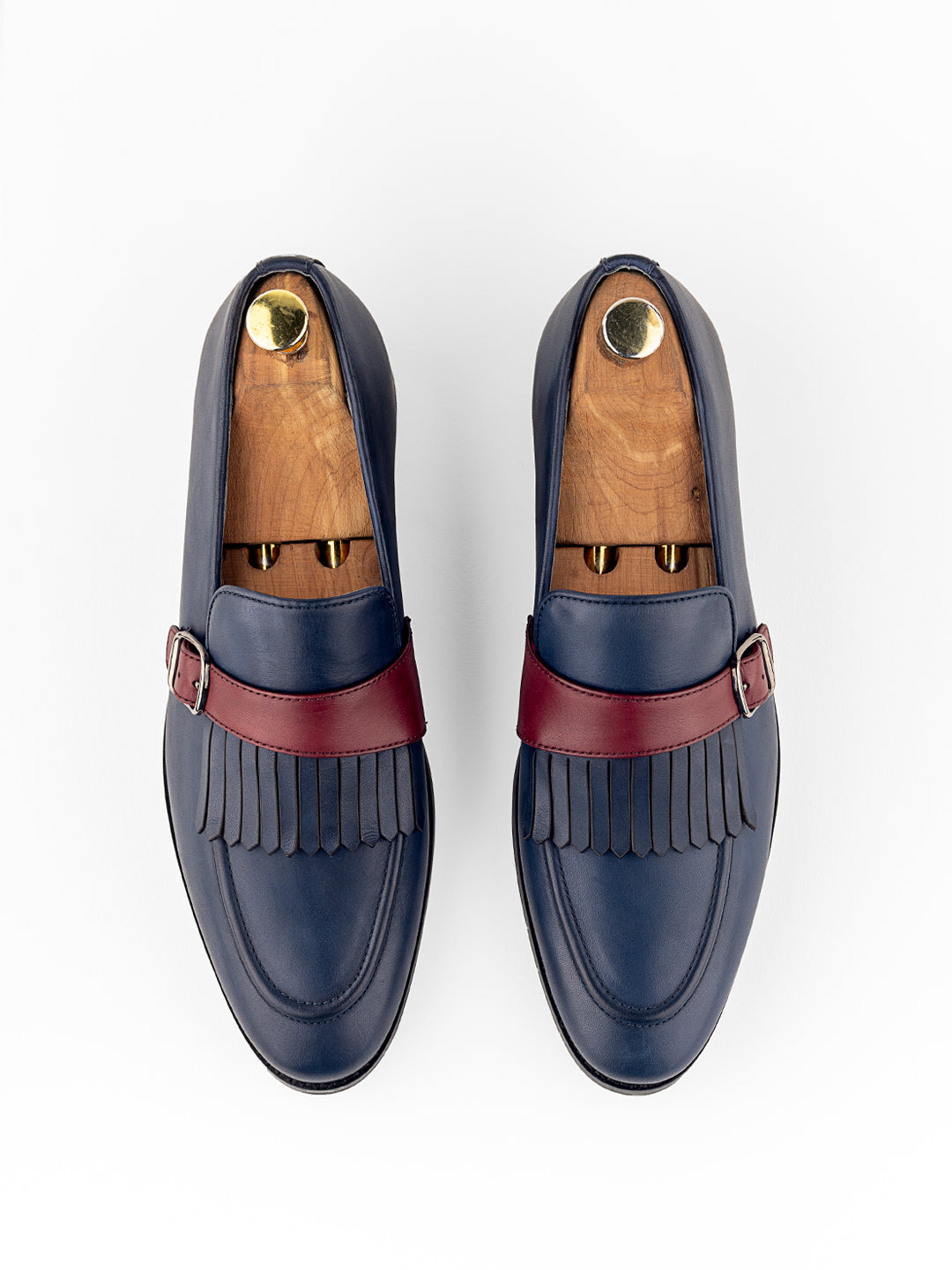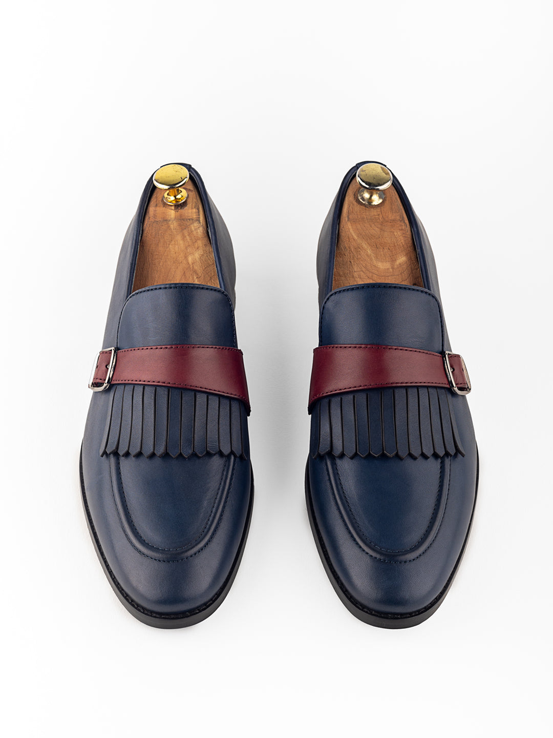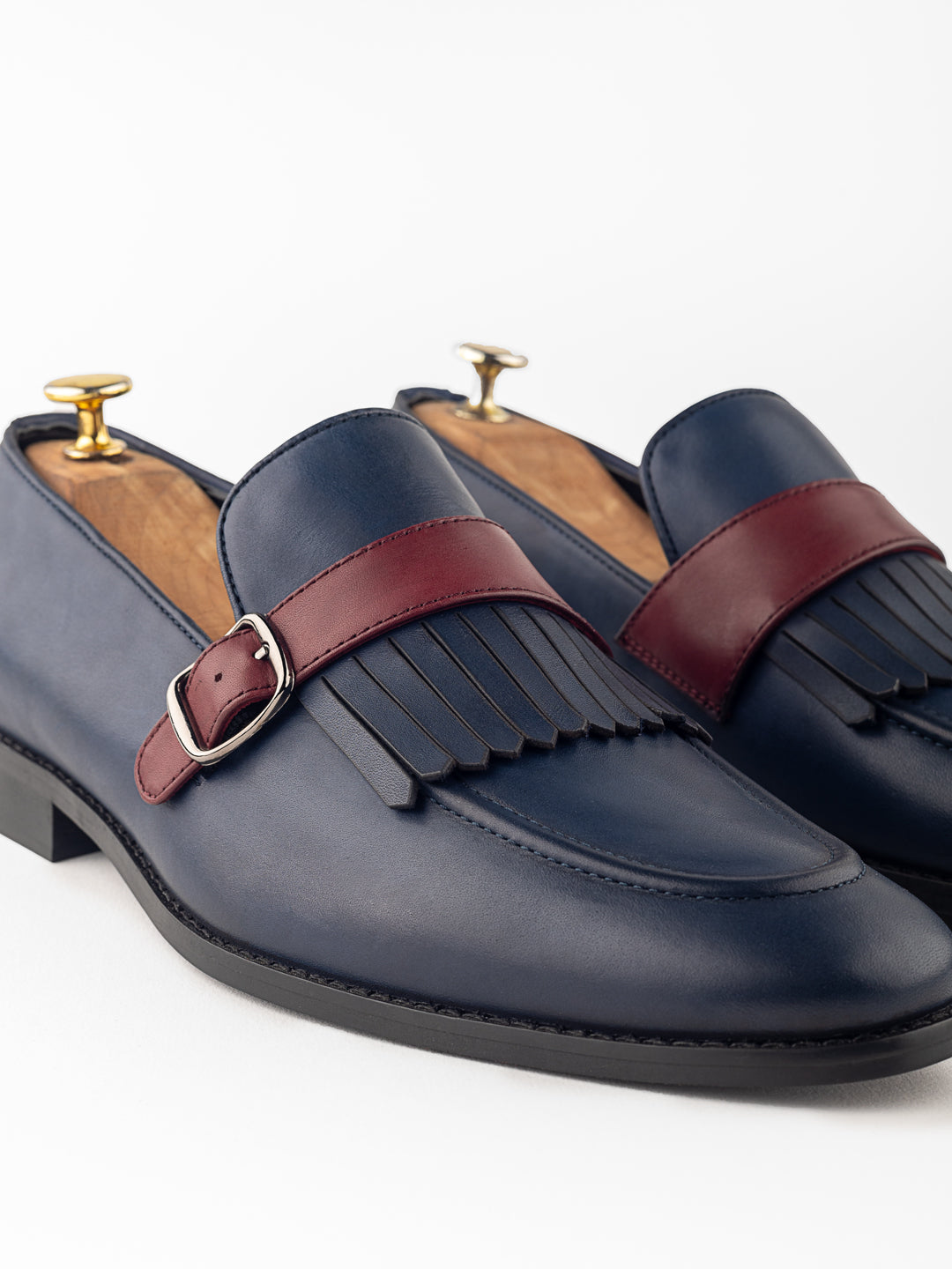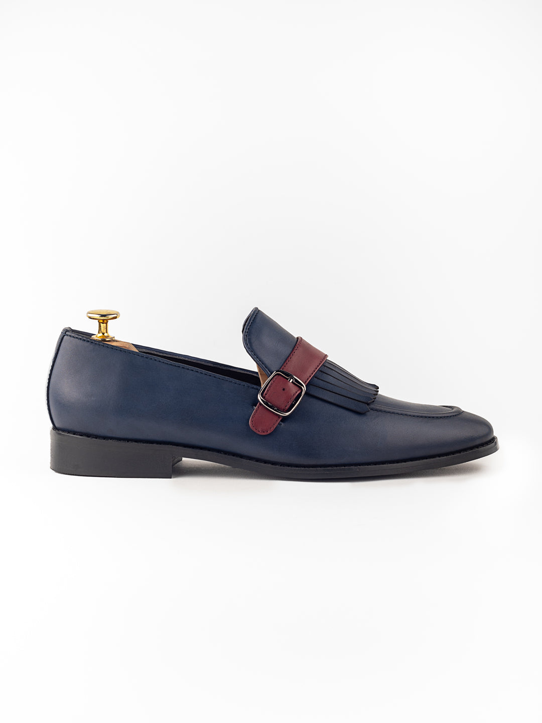 - Navy blue with Wine belt on top which has metal Buccle on top.