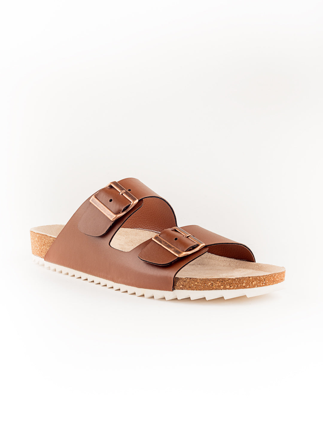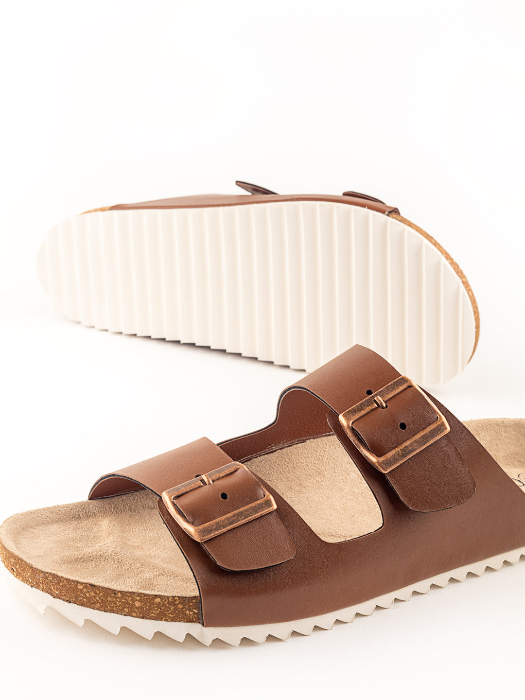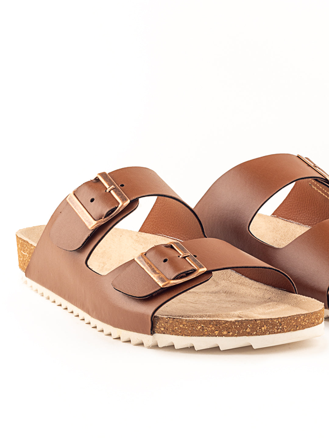 • The double buckle with Faux leather strap transitions to a beautiful TAN colour tone throughout the body of the slider.