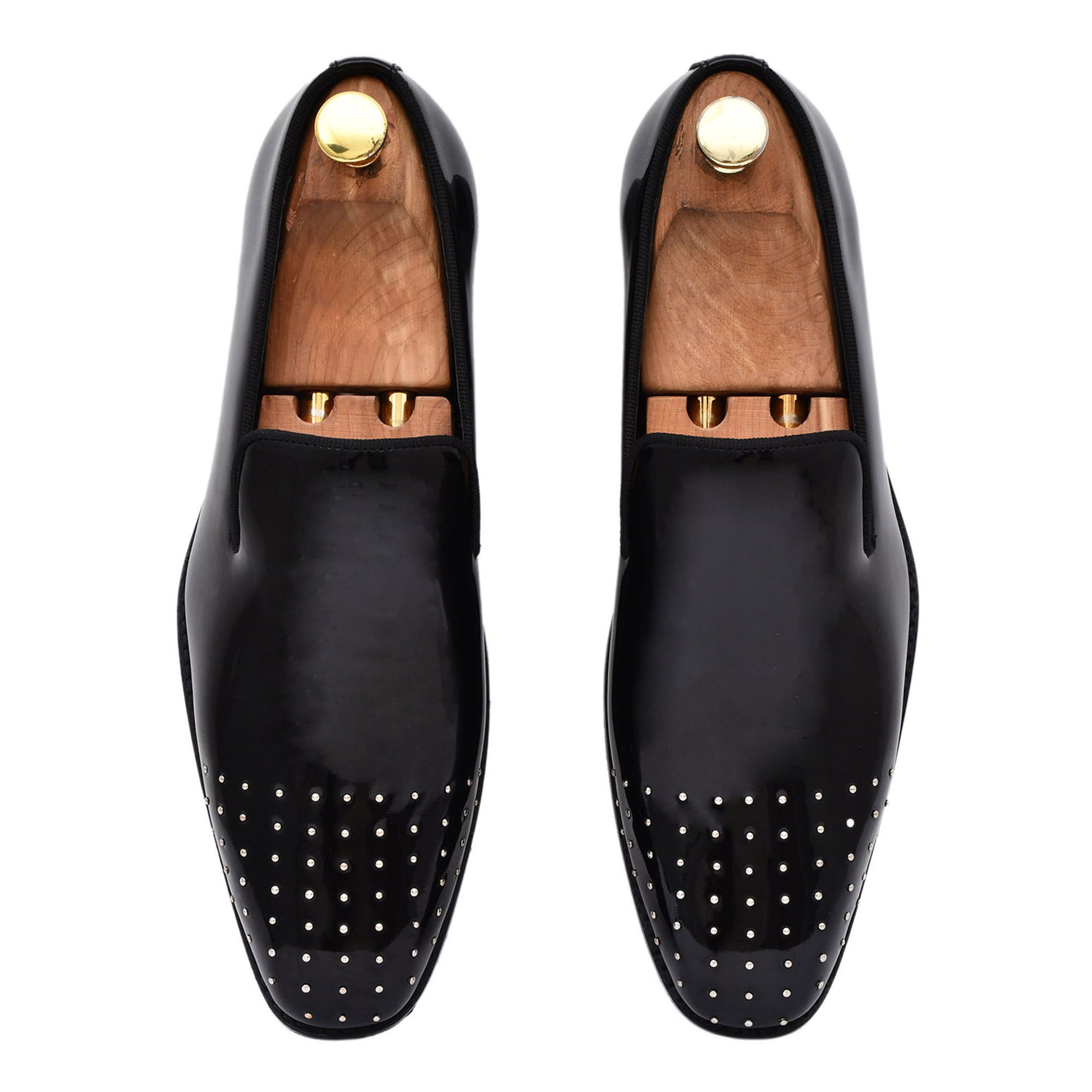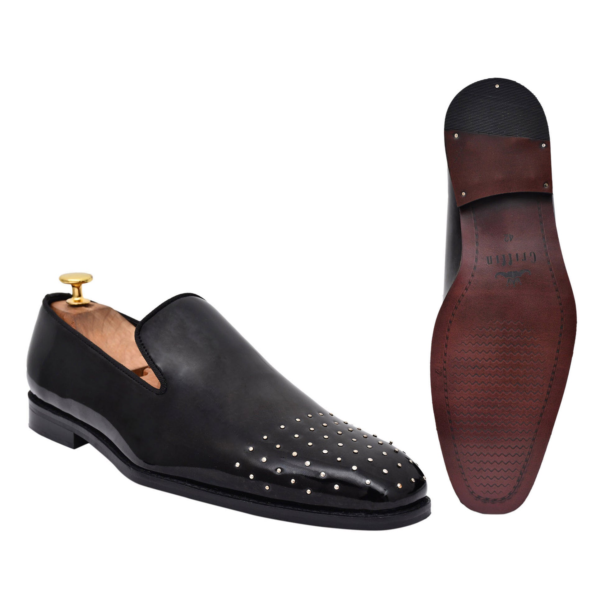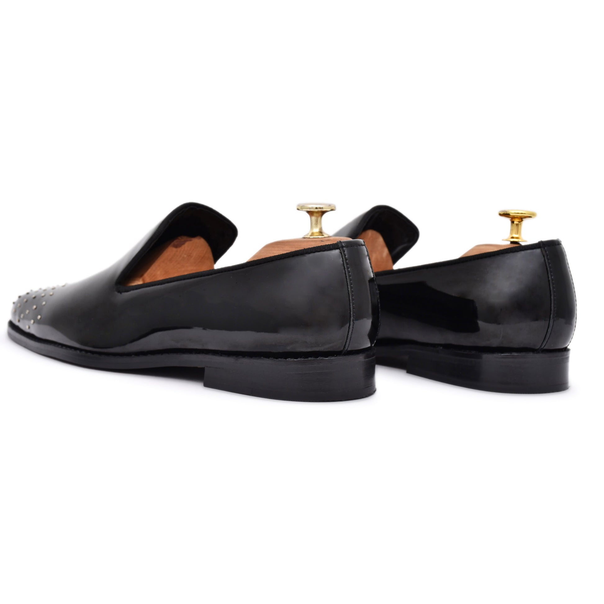 - SILVER PIN STUDDED Slip-on in faux Patent leather to make your night super glamorous.