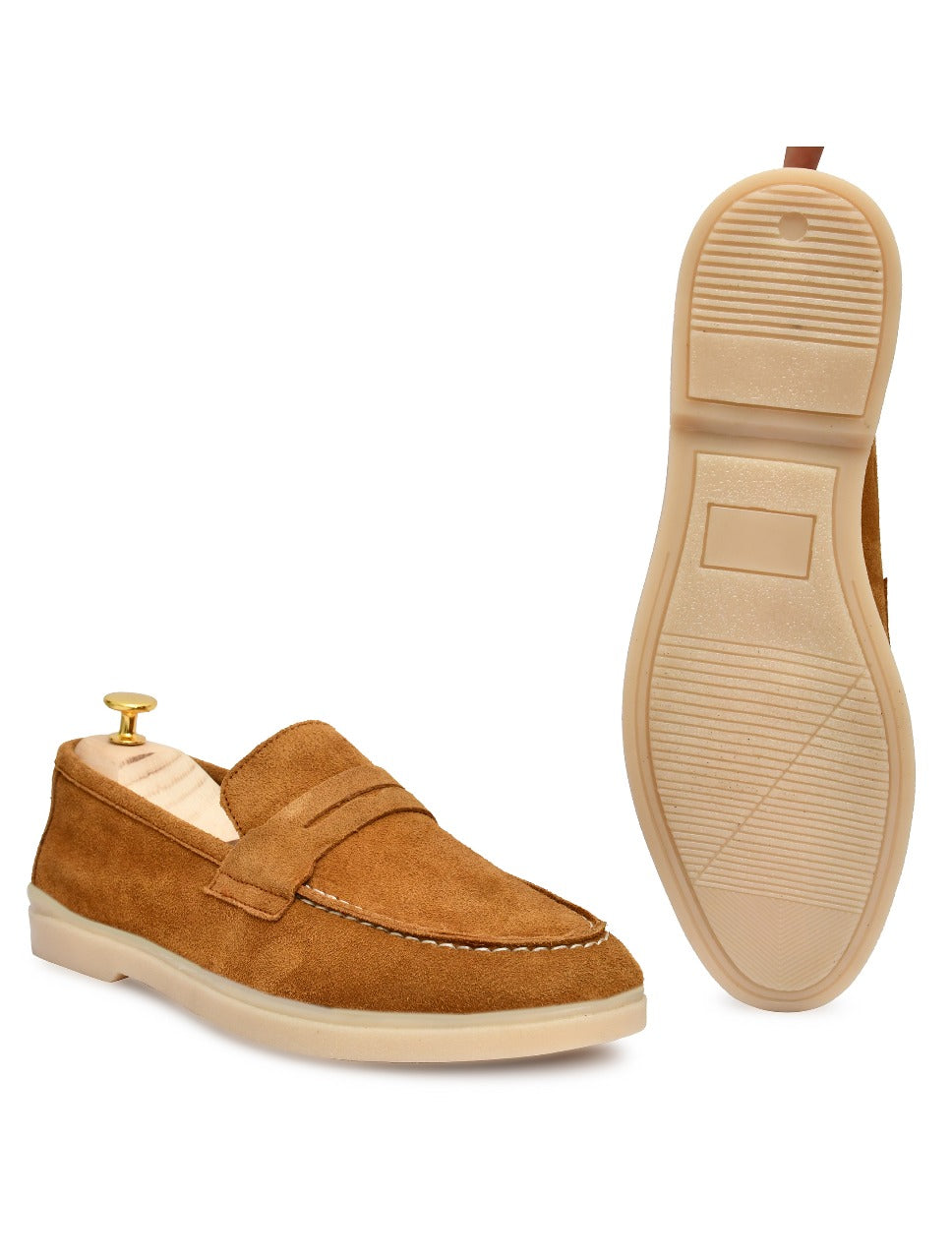 - The Tan colour suede with penny loafer style and honey colour sole transitions to a beautiful Tan tone throughout the body of the shoe.