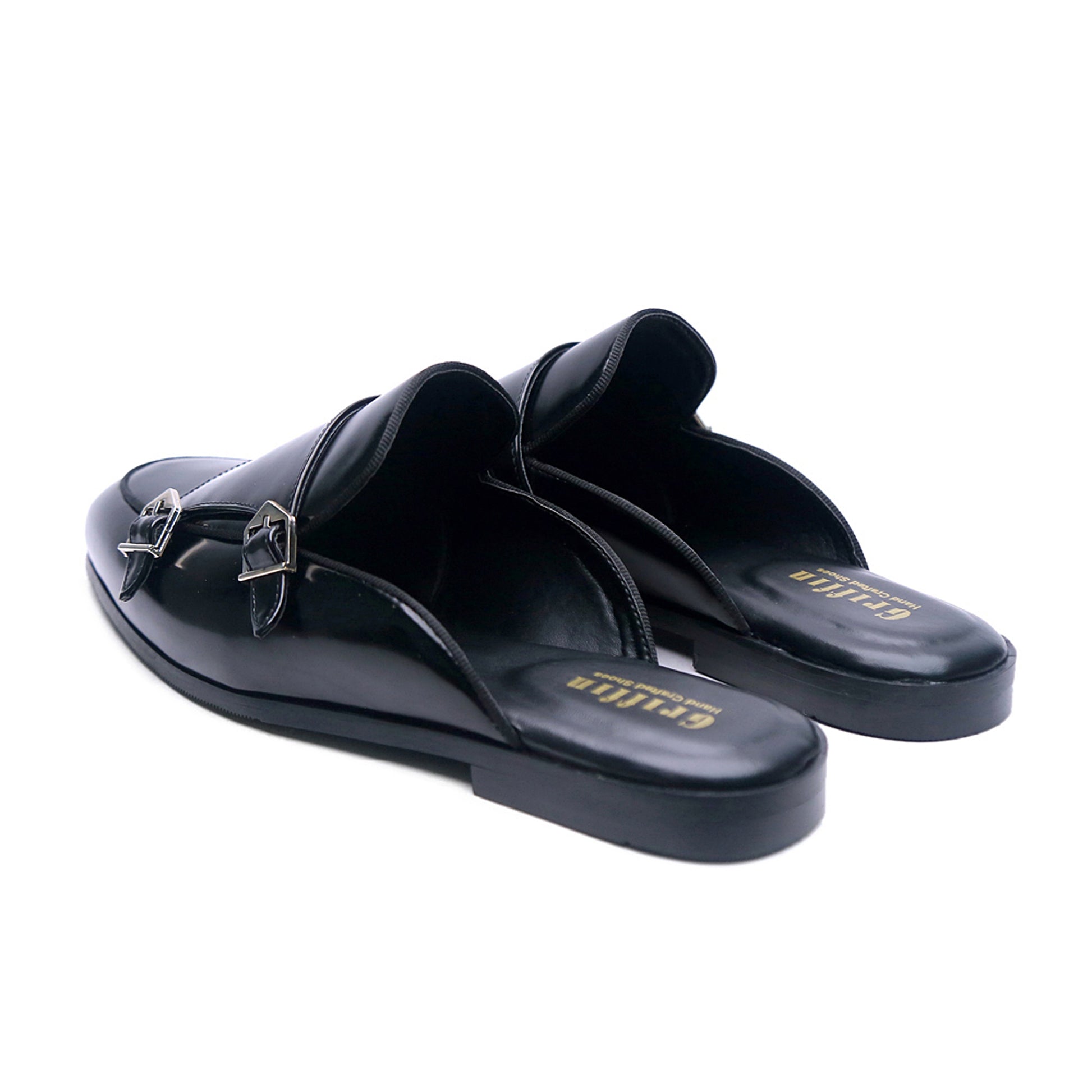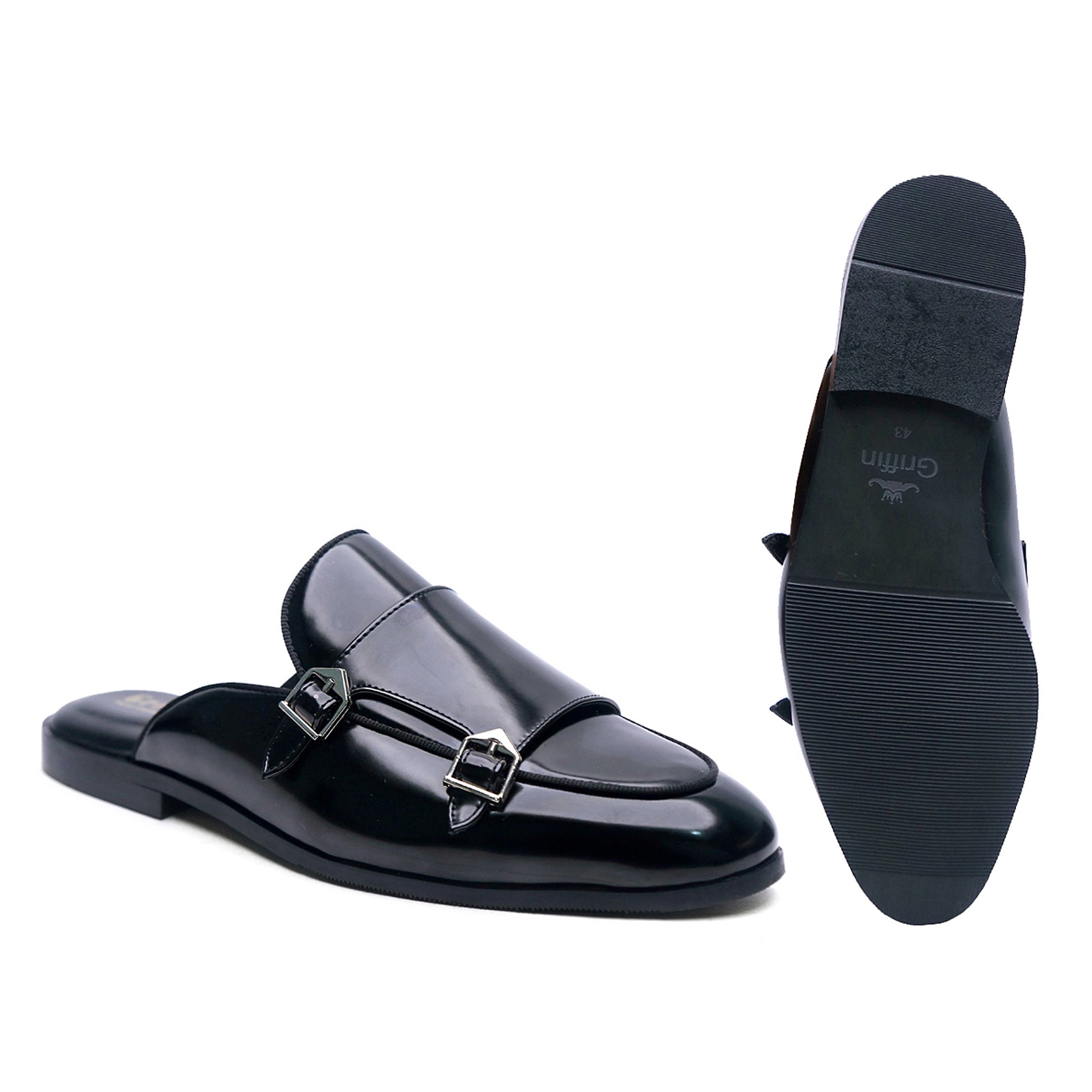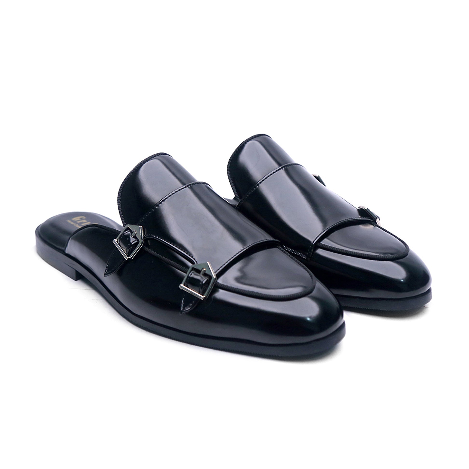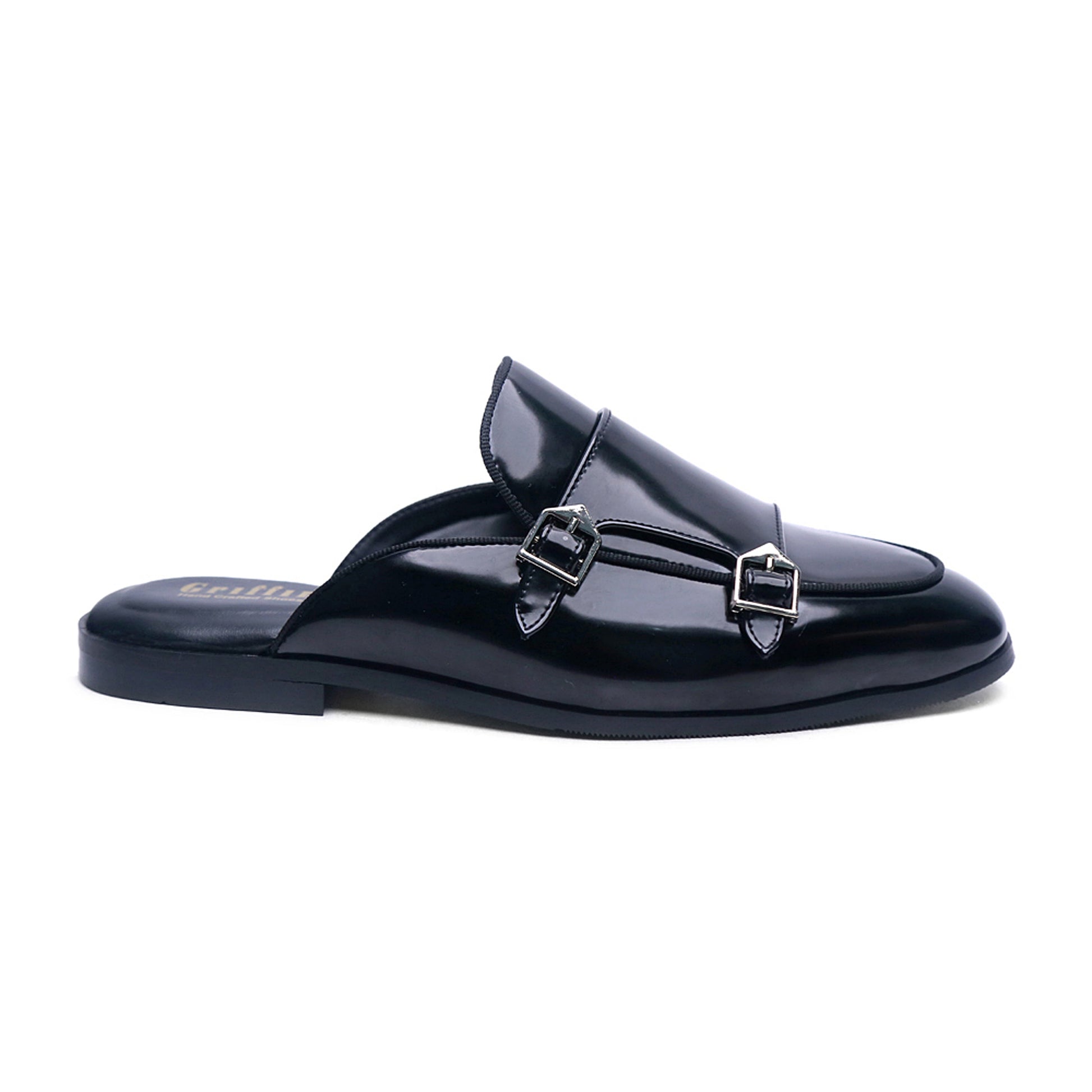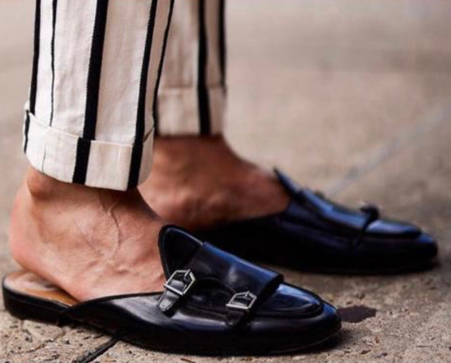 - The MONK STYLE MULE transitions to a beautiful BLACK WITH SILVER BUCCLE throughout the body of the shoe.