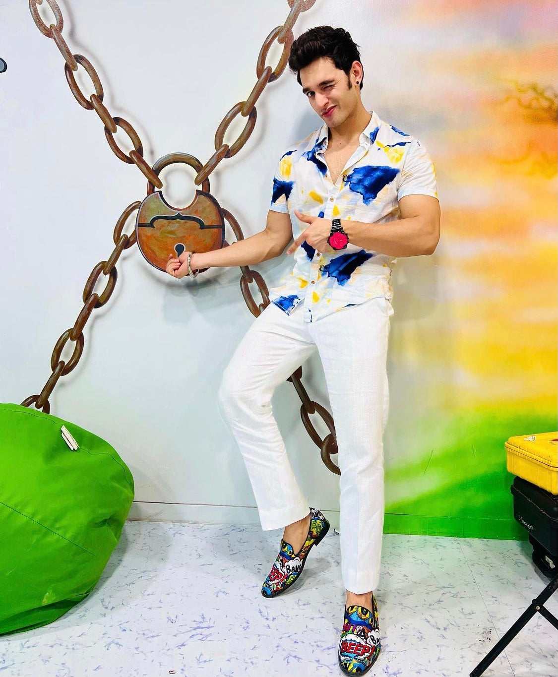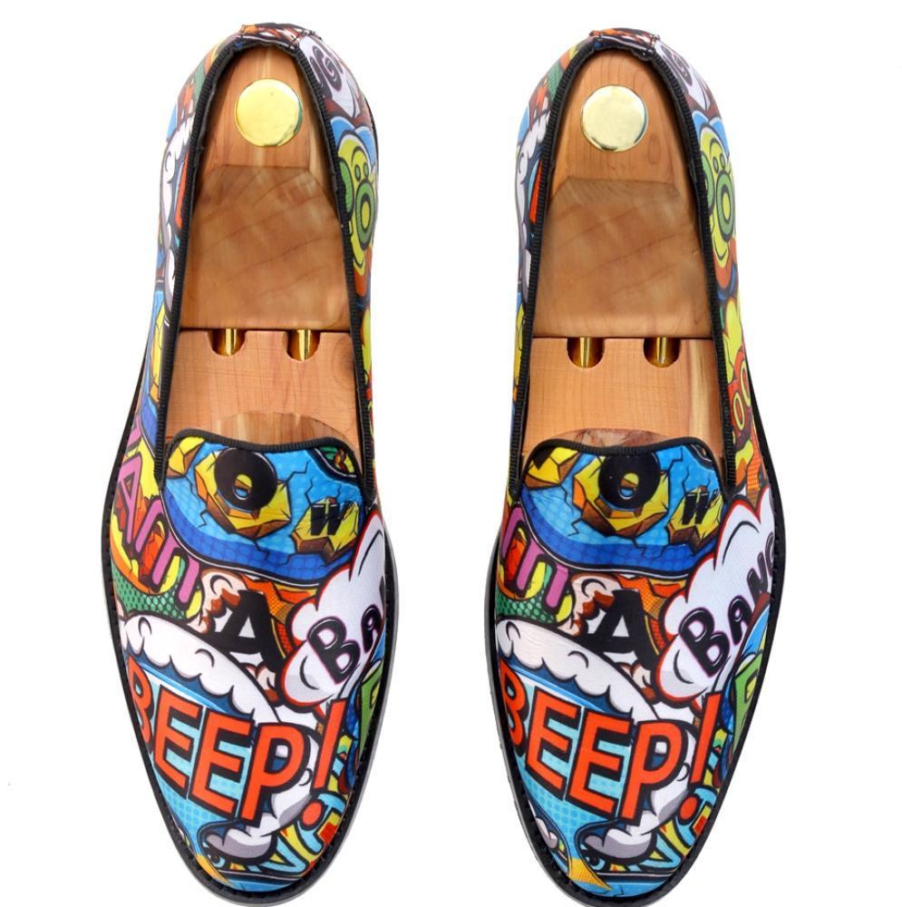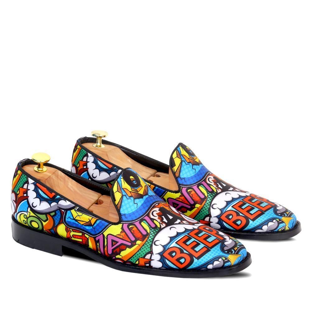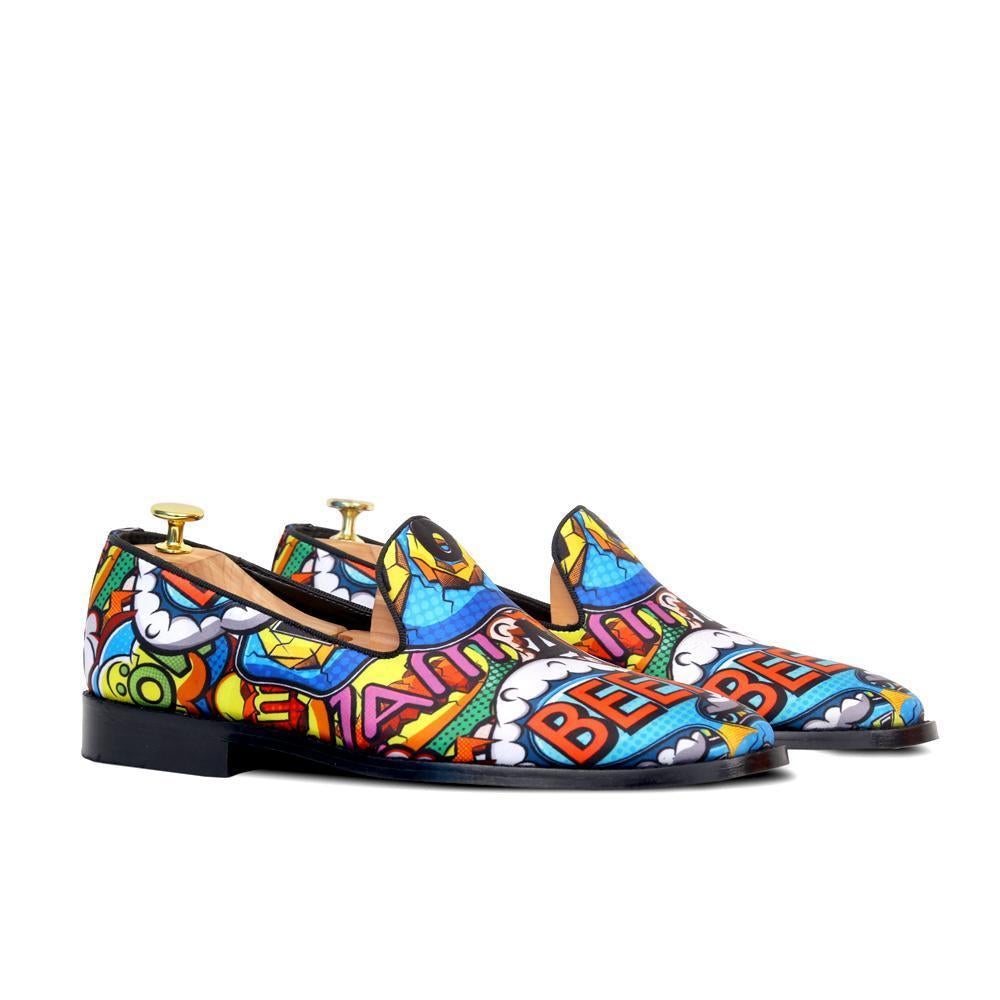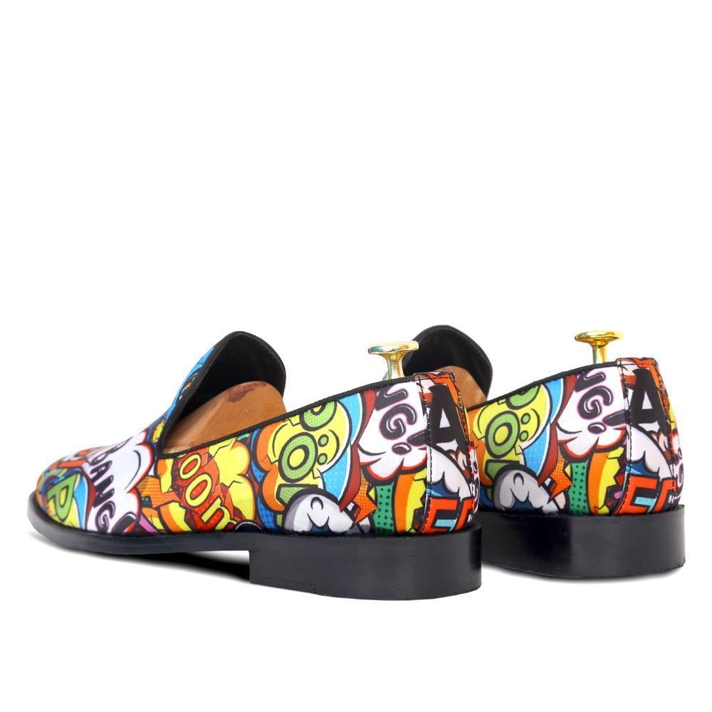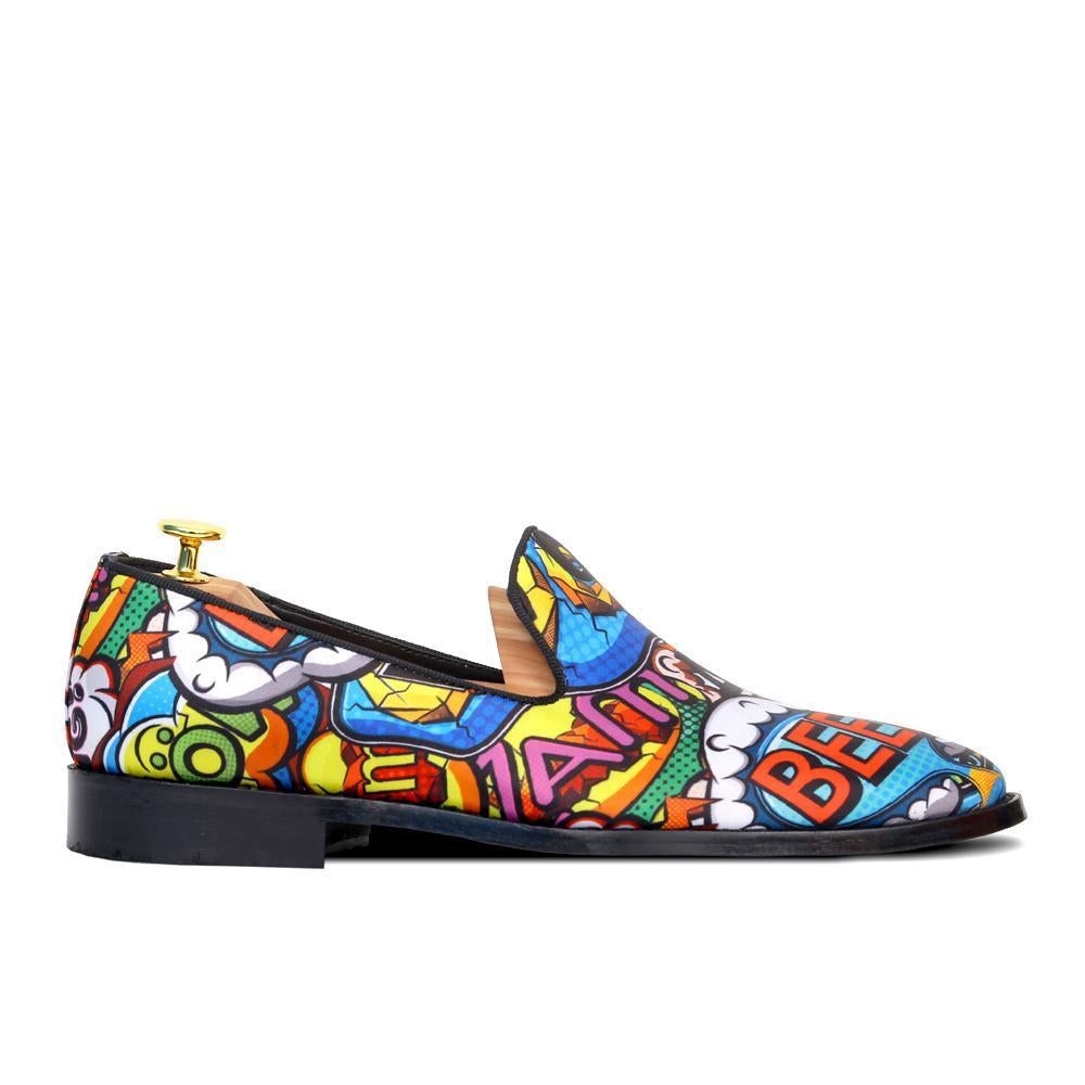 - Designer BOOM POW COMICS – faux leather print in multi coloured fabric stitched and designed as round-shaped slip-ons with BOOM POW SLOGAN