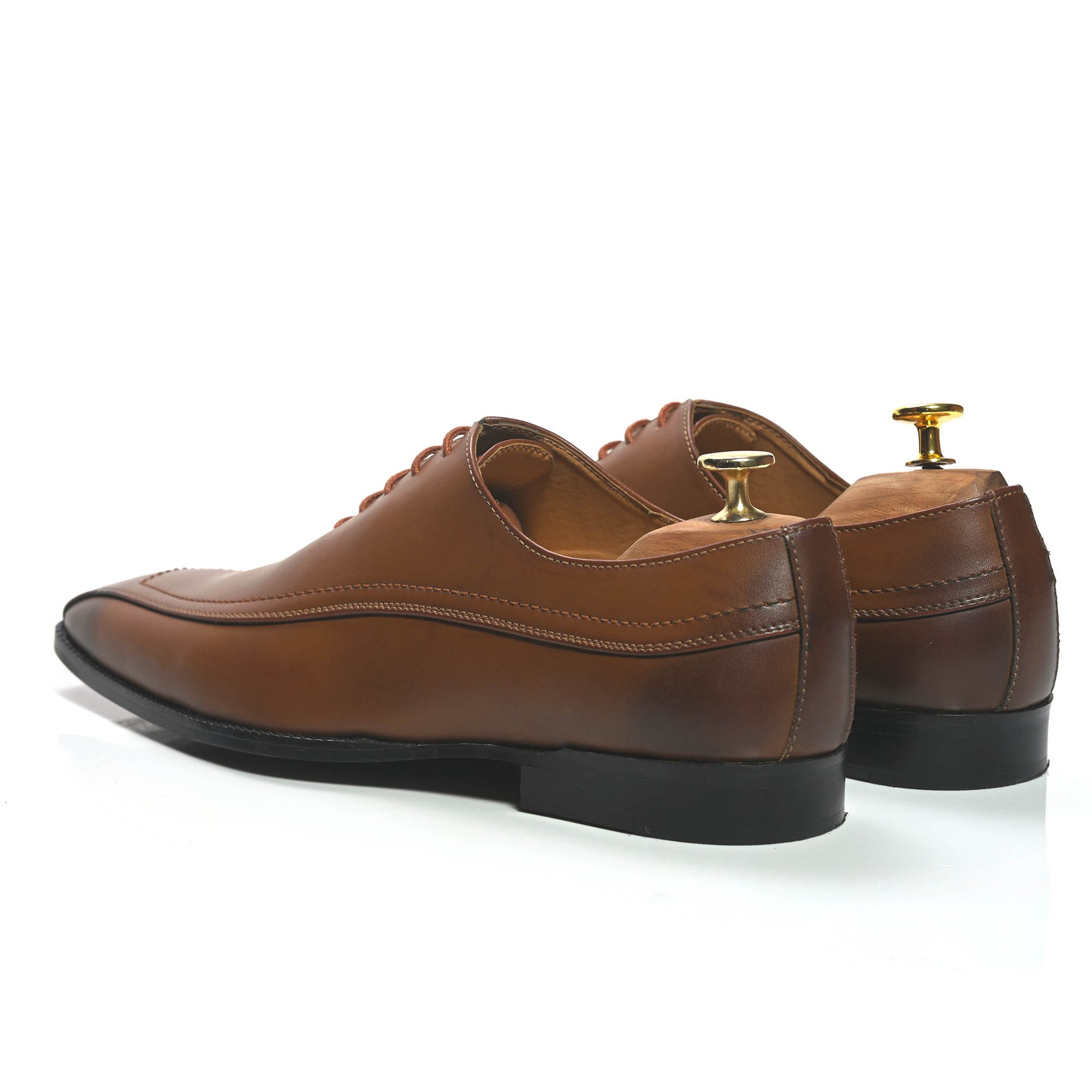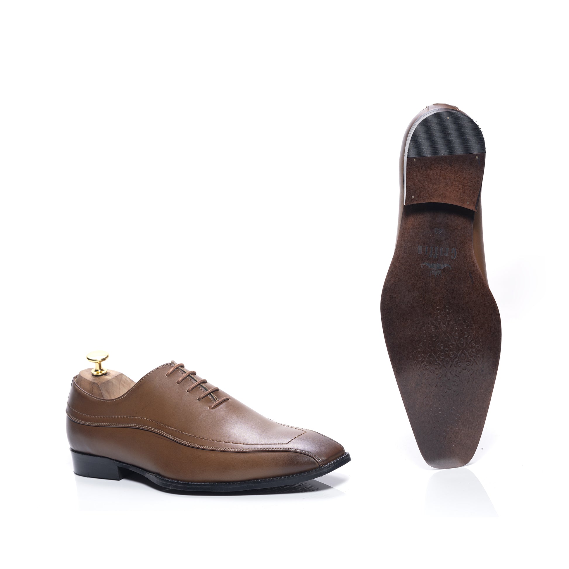 - TAN LACEUP SHOES CROCODILE STYLE WITH handcrafted SOLE AND THREAD WORK IN FAUX LEATHER