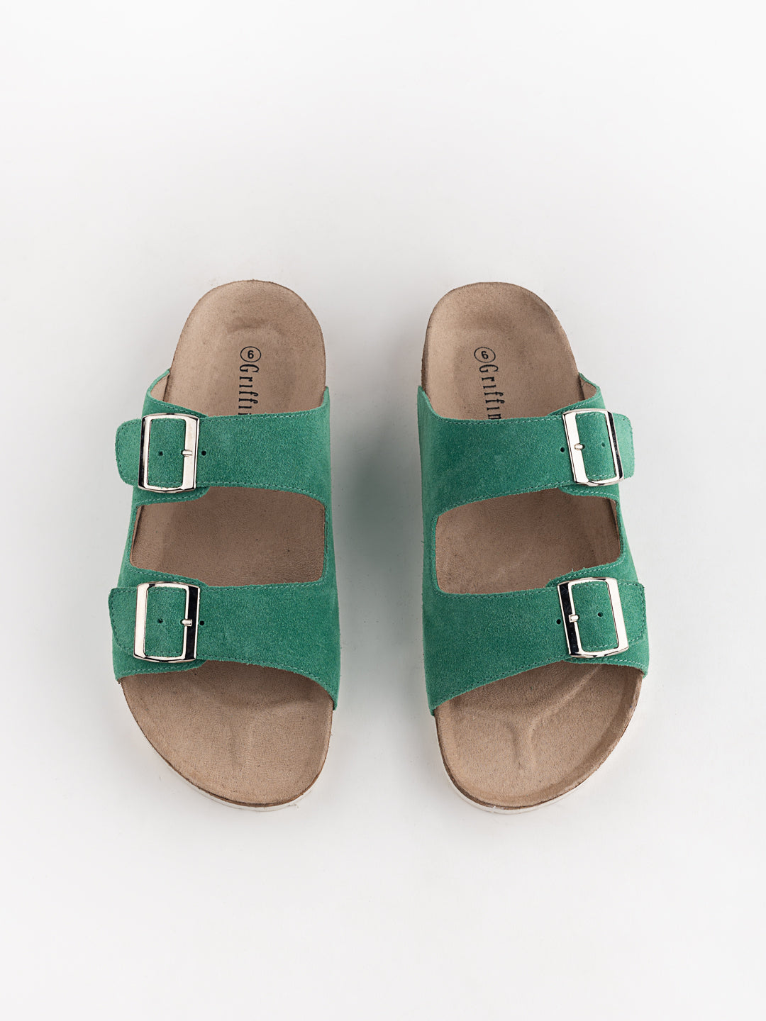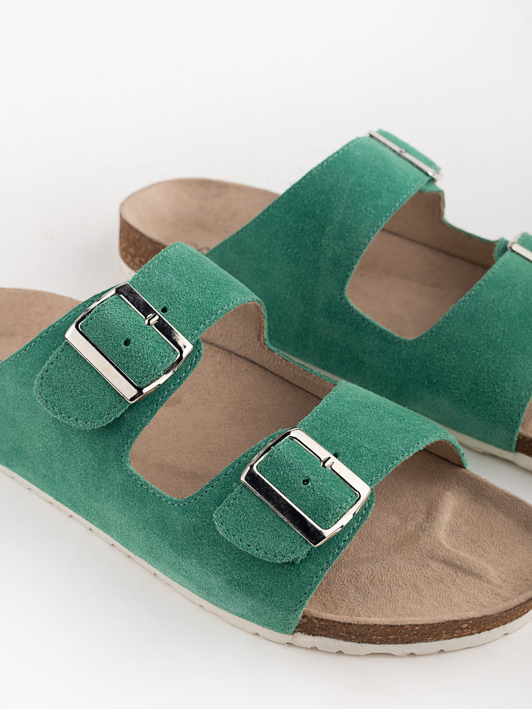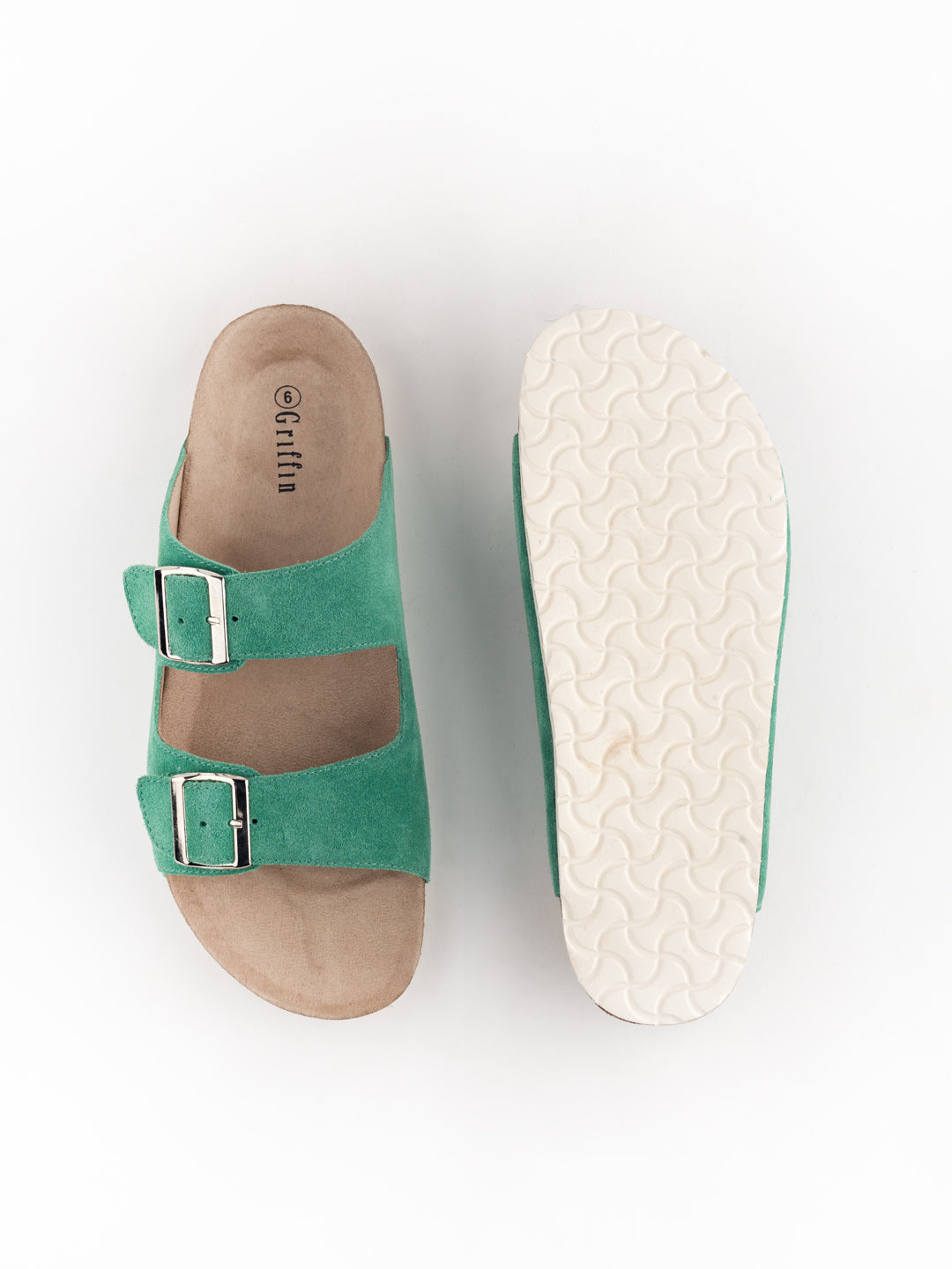 • The double buckle suede leather strap transitions to a beautiful light green colour tone throughout the body of the sandle slider.