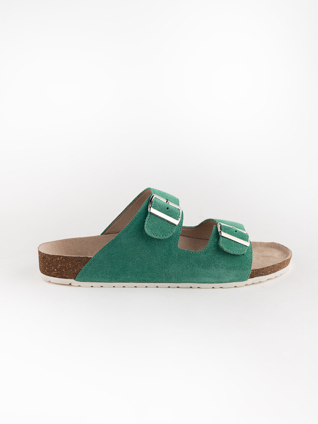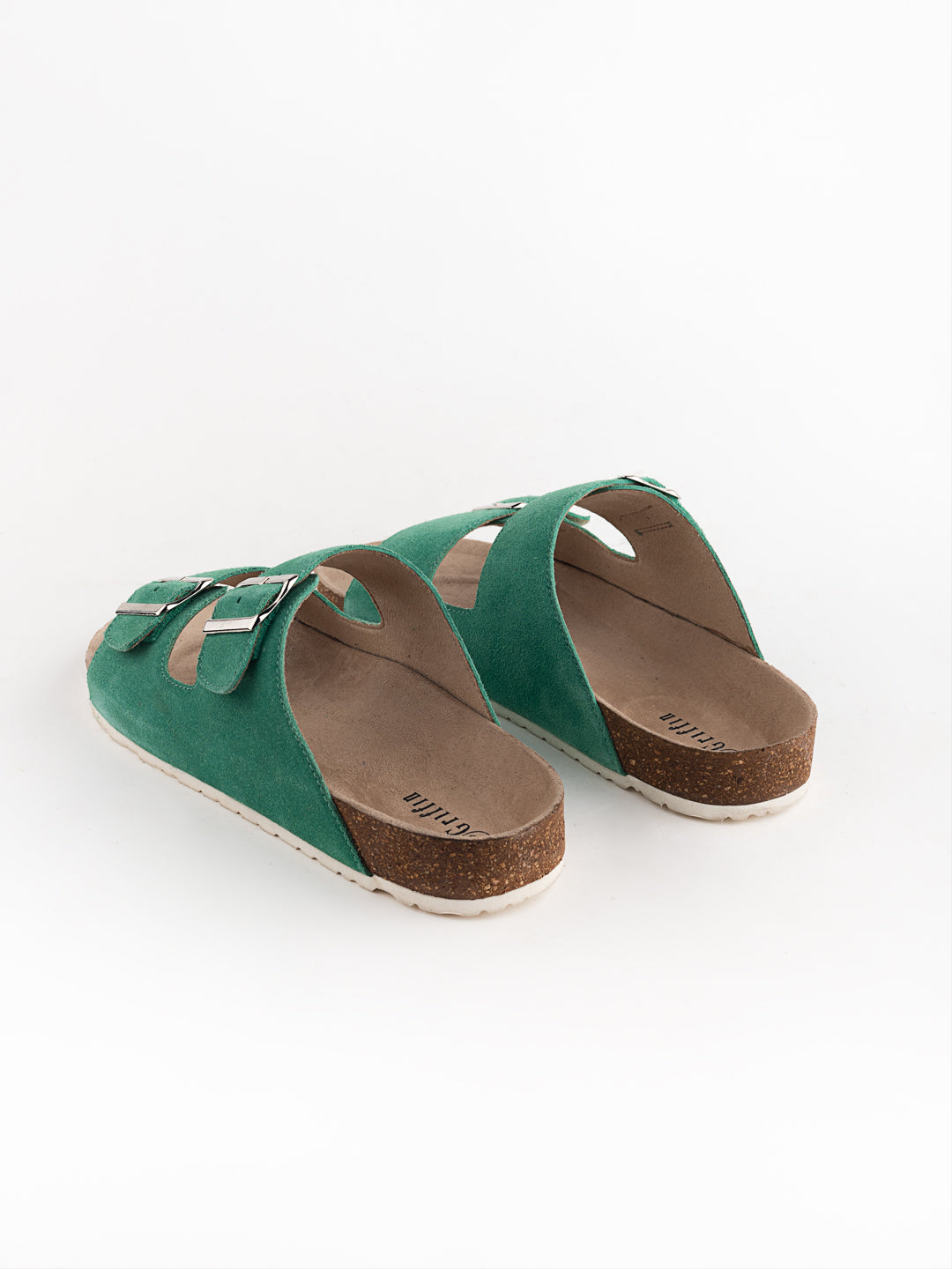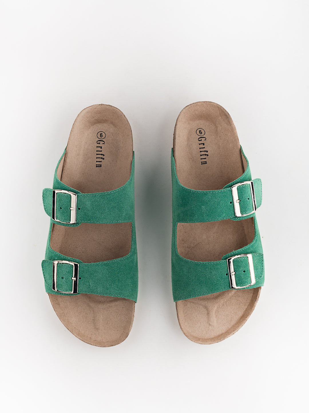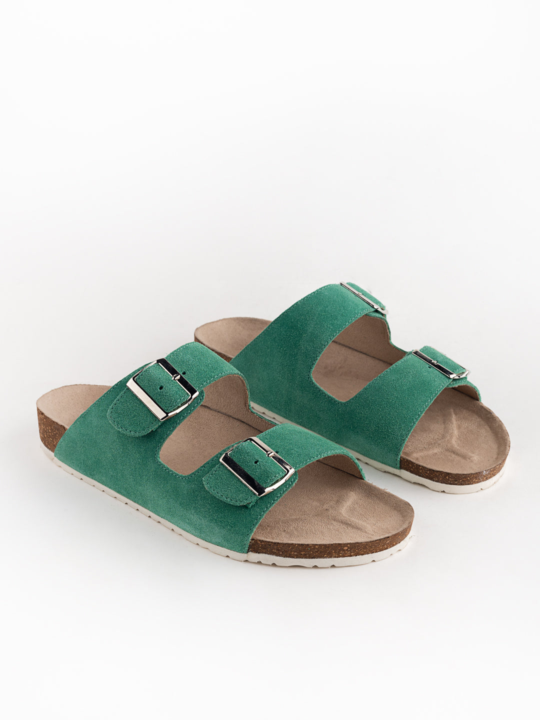 • The double buckle suede leather strap transitions to a beautiful light green colour tone throughout the body of the sandle slider.