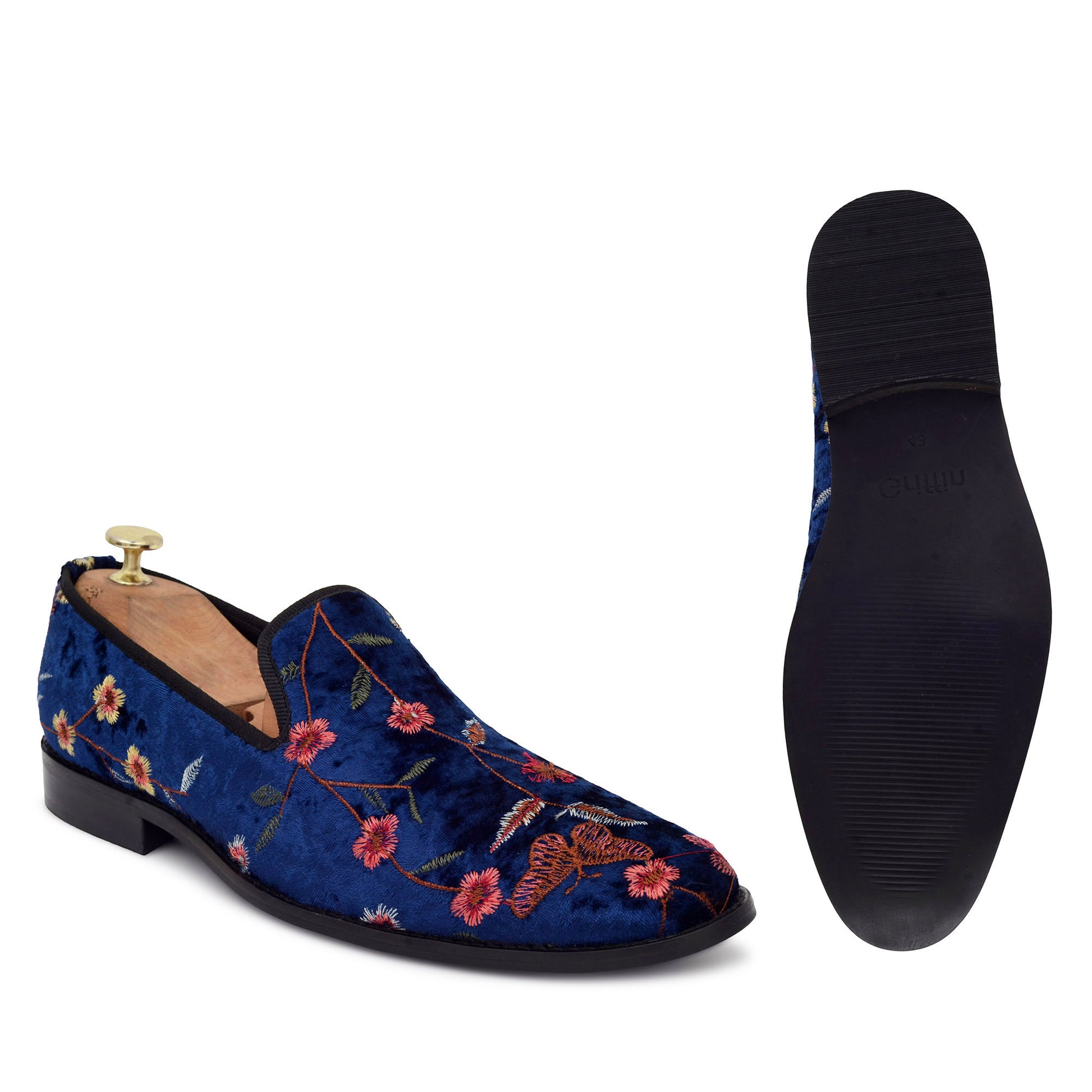 - INDIGO velvet Embroidery slip-on shoes with multi thread embroidery on top, handcrafted with premium Italian materials. Griffin logo embossed on the sole. Fits true to size.