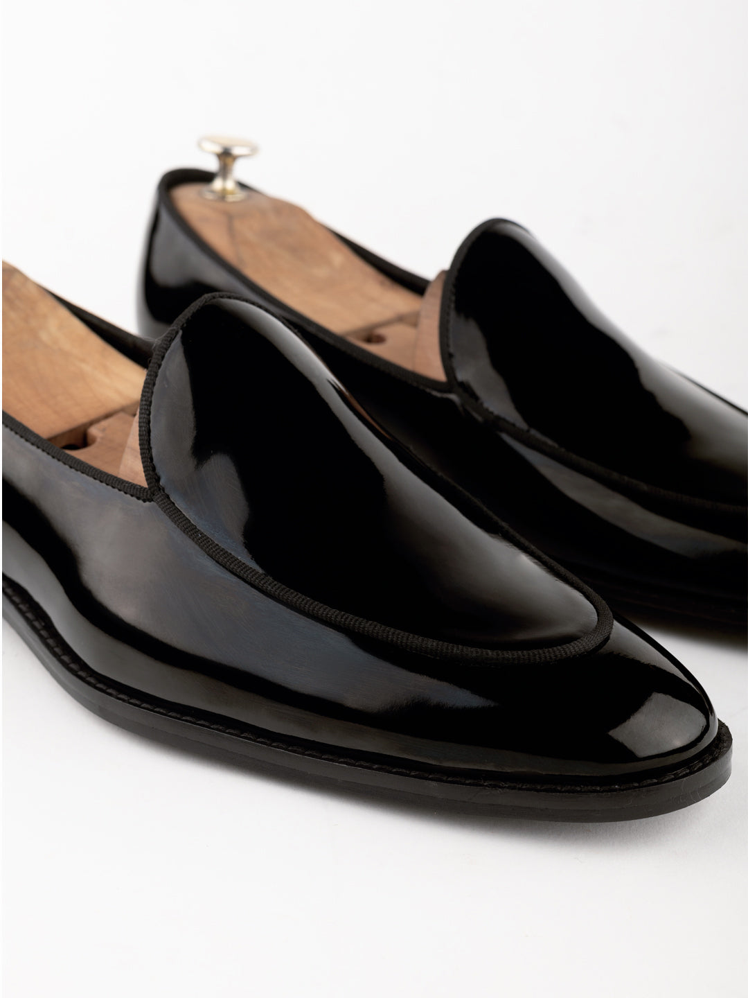 BLACK PATENT LOAFERS SHOES WITH GROSSGRAIN PIPING DESIGNED AND HANDCRAFTED AS ER VIGEVANO, ITALY, ACCORDING TO THE TRADITIONAL "A SACCHETTO" TECHNIQUE WITH PATENT FAUX LEATHER IN SYNTHETIC LINING AND HAND-CRAFTED T-UNIT SOLES.