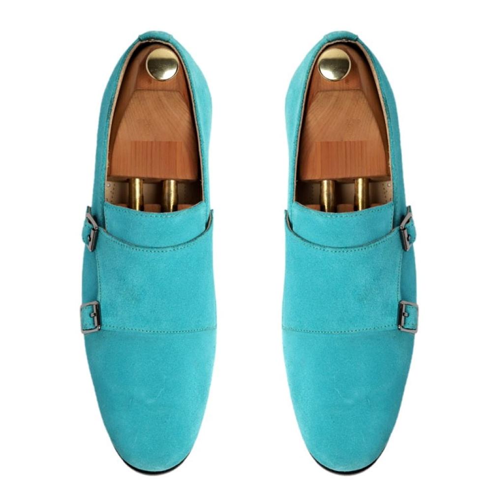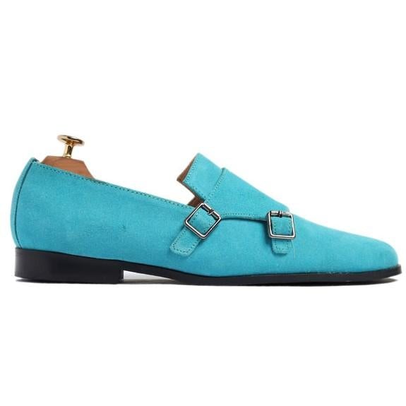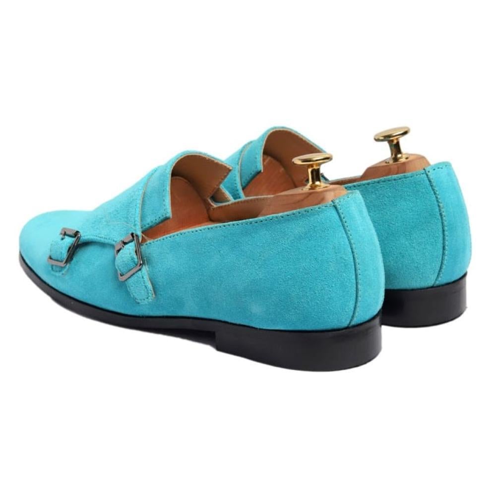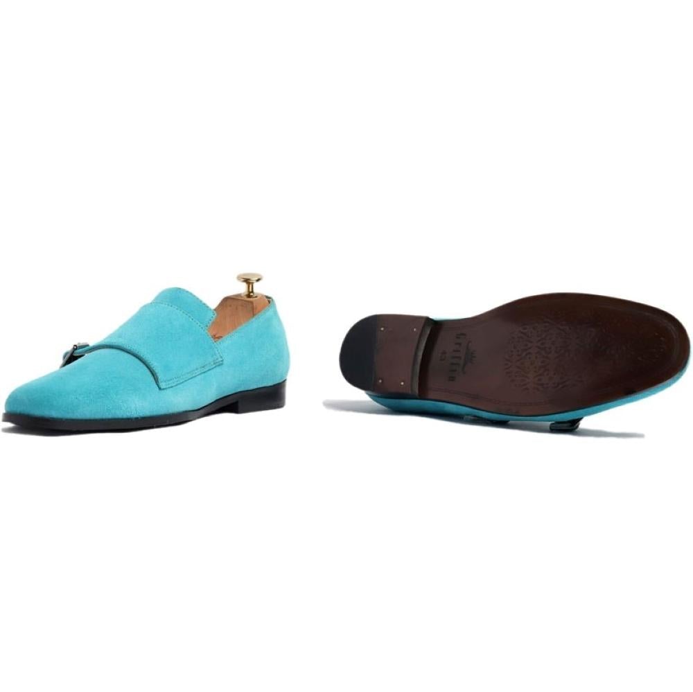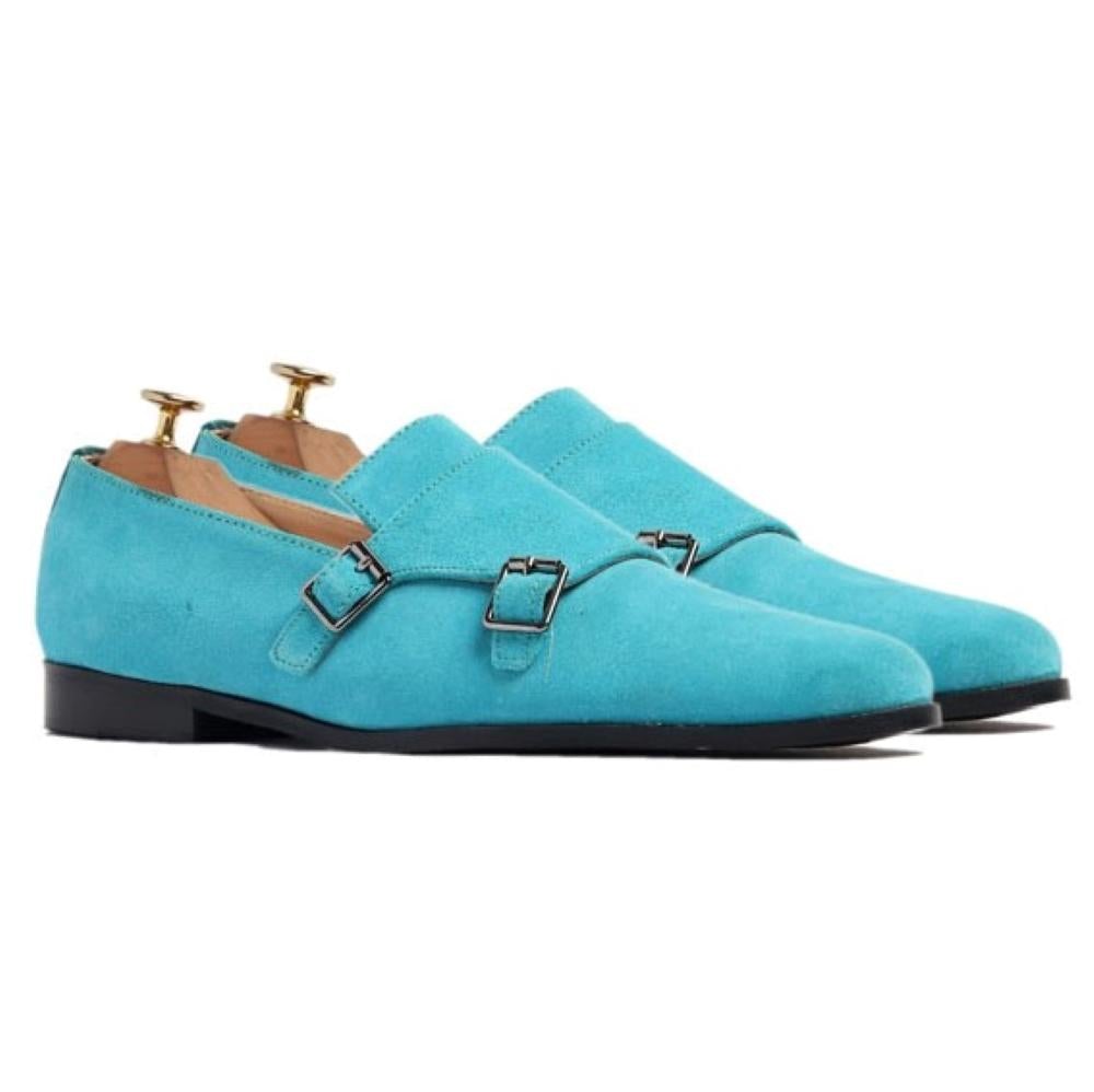 - Material : Sky blue Suede leather. With Double metal batwing belt on top