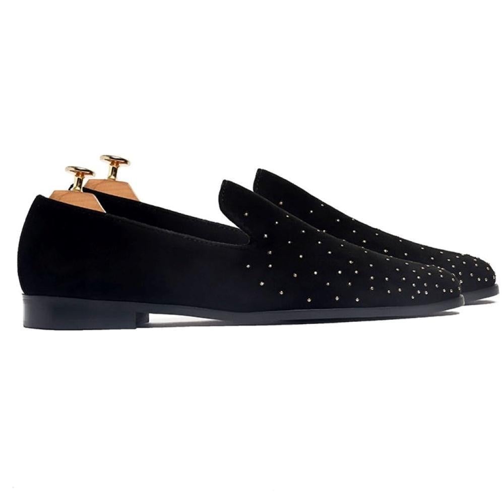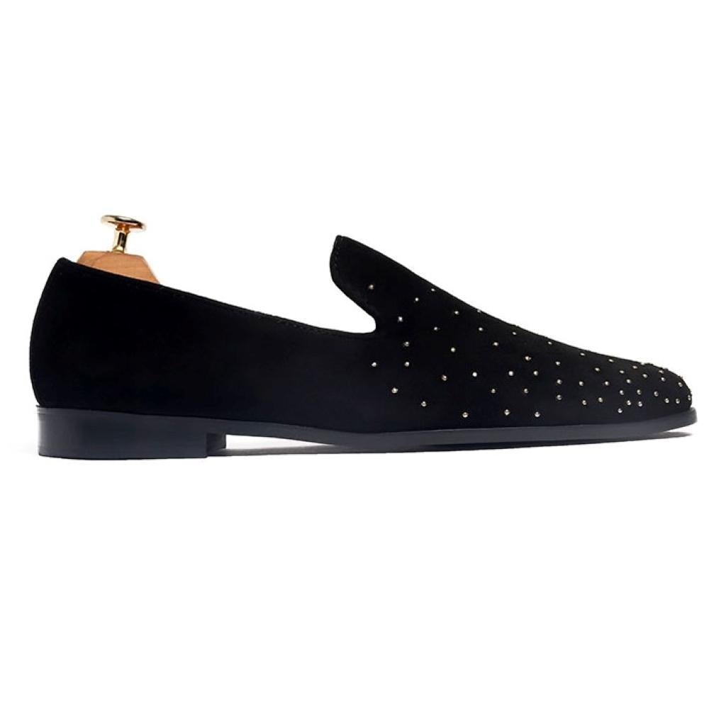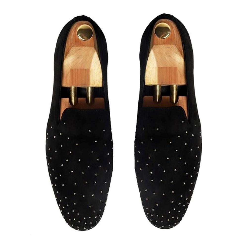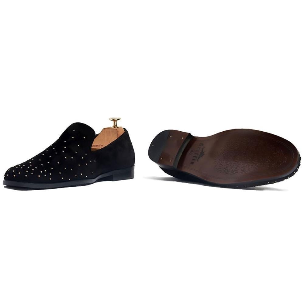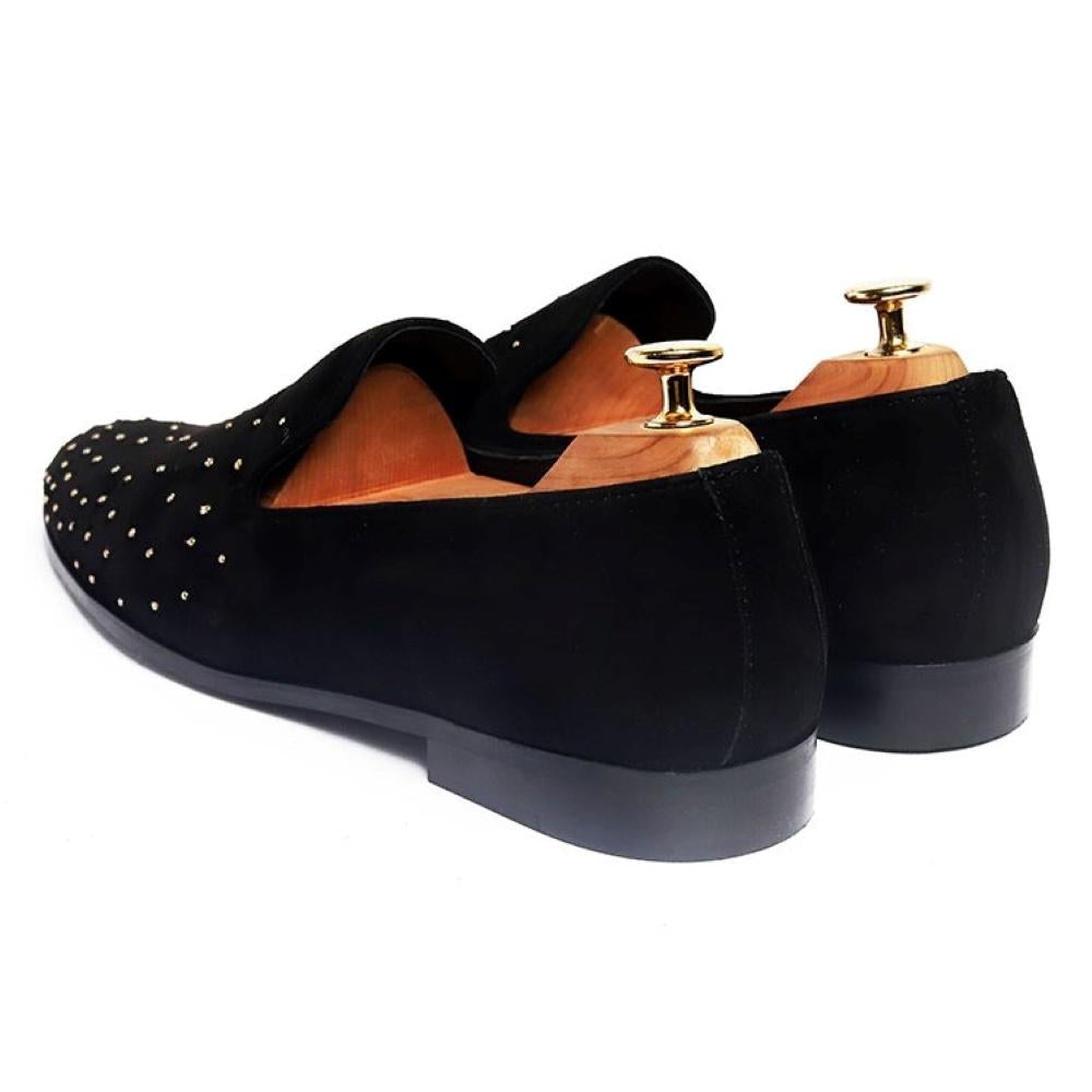 - Designer Metal Pins Fitting in Gold color–Suede leather dyed in coal colored pigment, stitched and designed as round-shaped slip-ons with studded pins