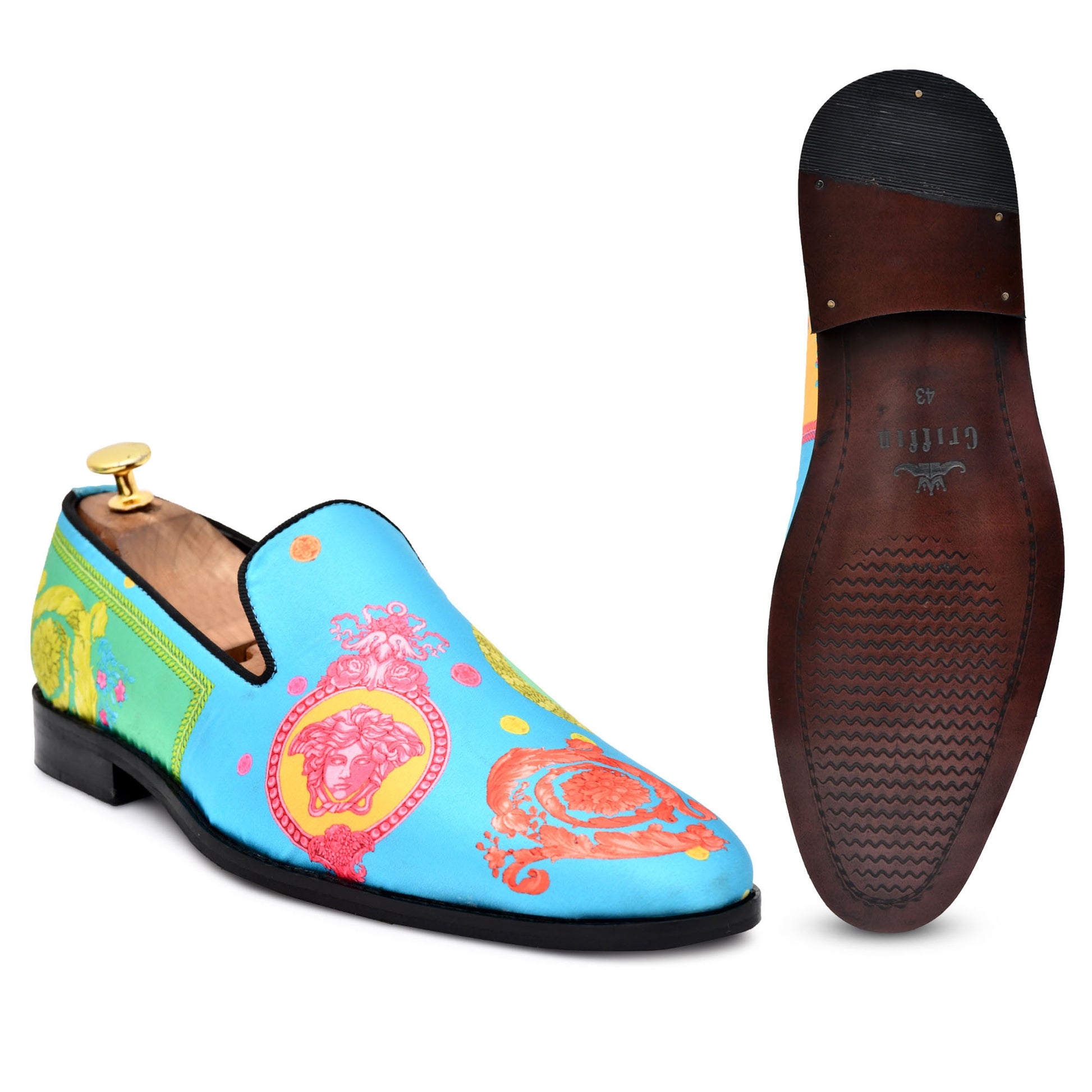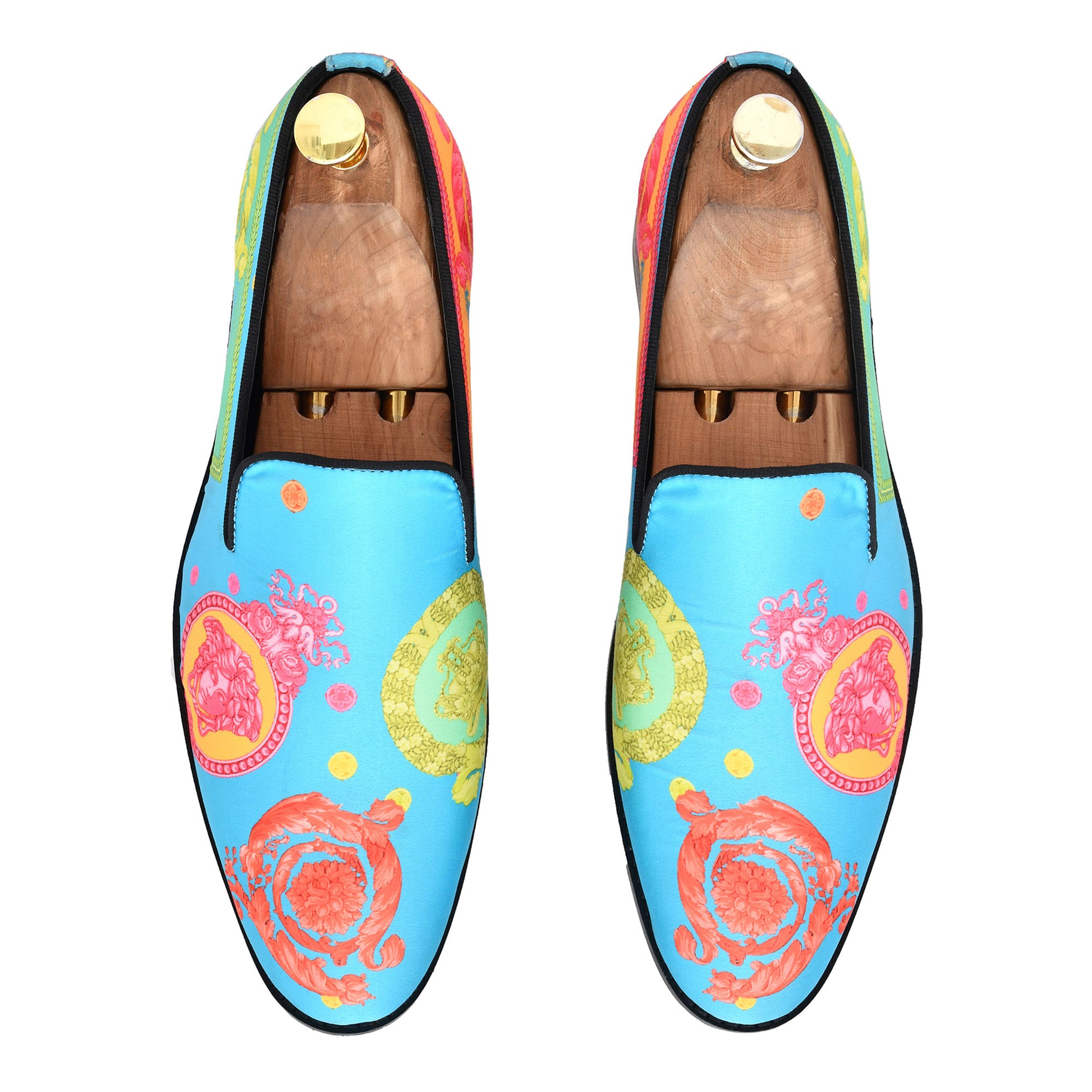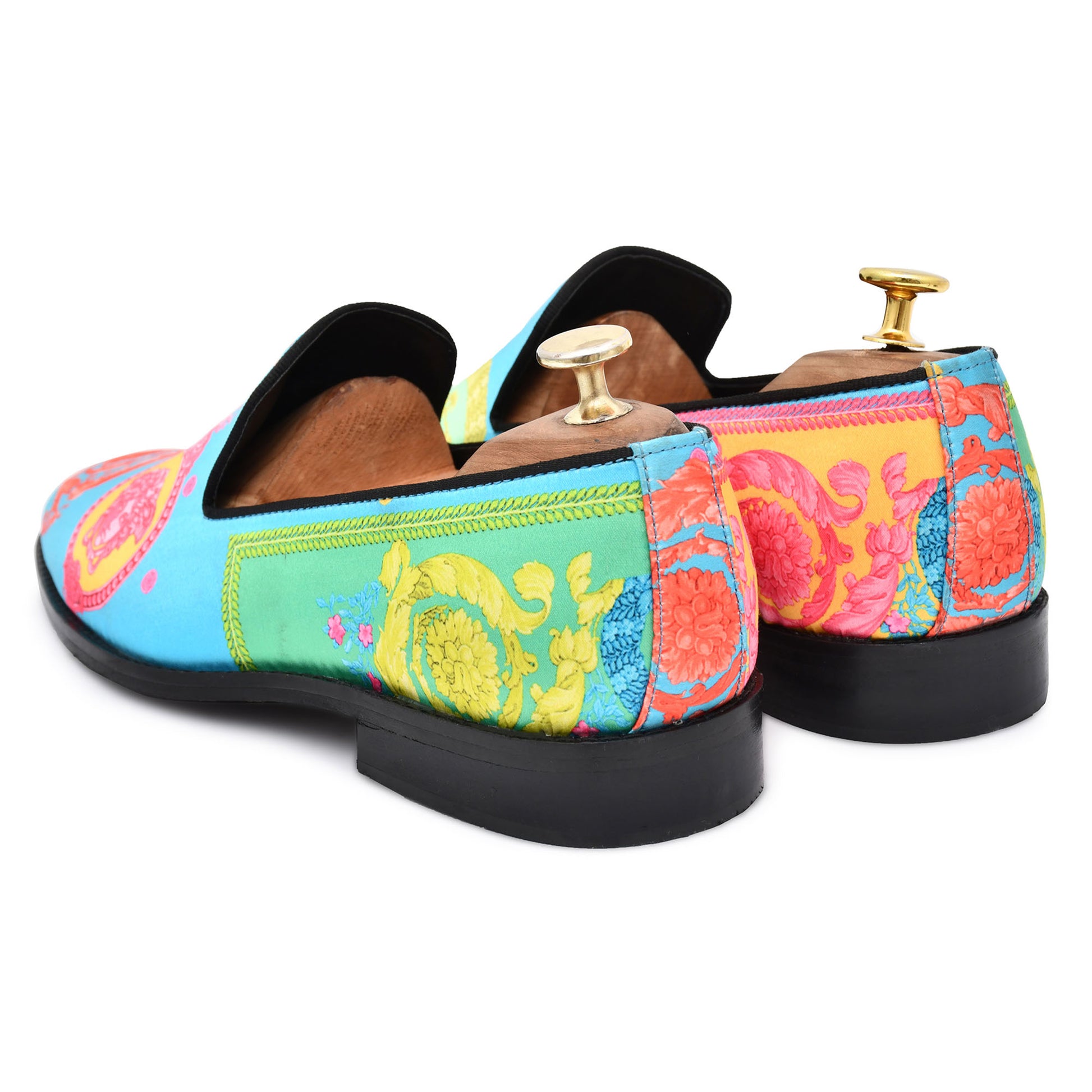 - Designer slip-on in faux fabric print with multi colour stitched and designed as round-shaped slip-ons .