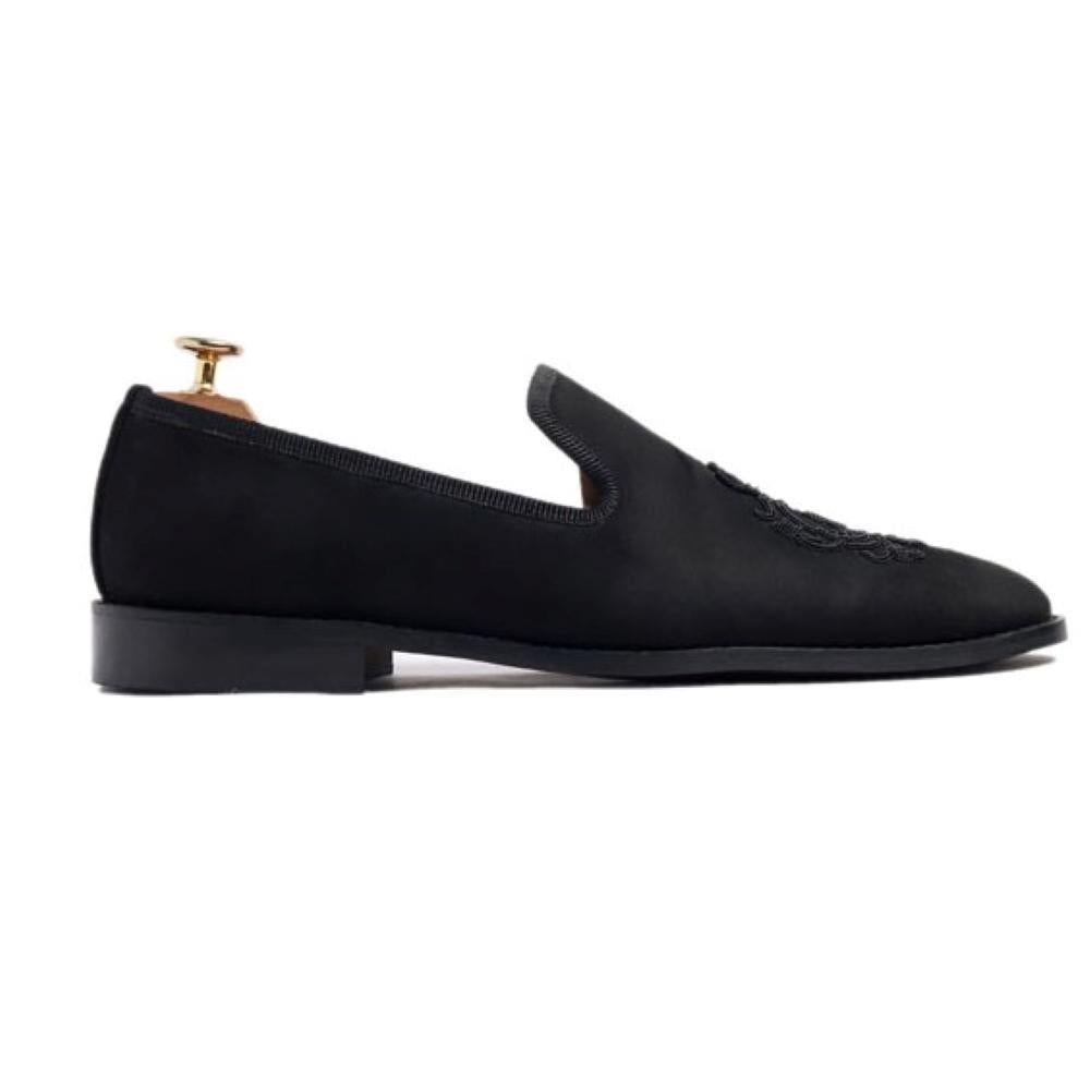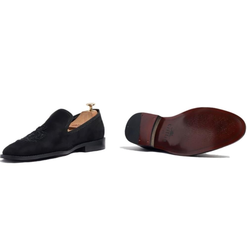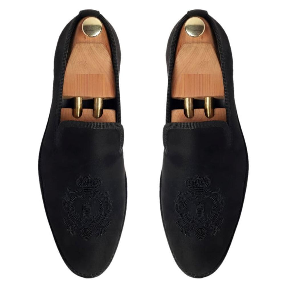 - Black Suede SLIP-ON comes with hand embroidered with black brass crown emblem .