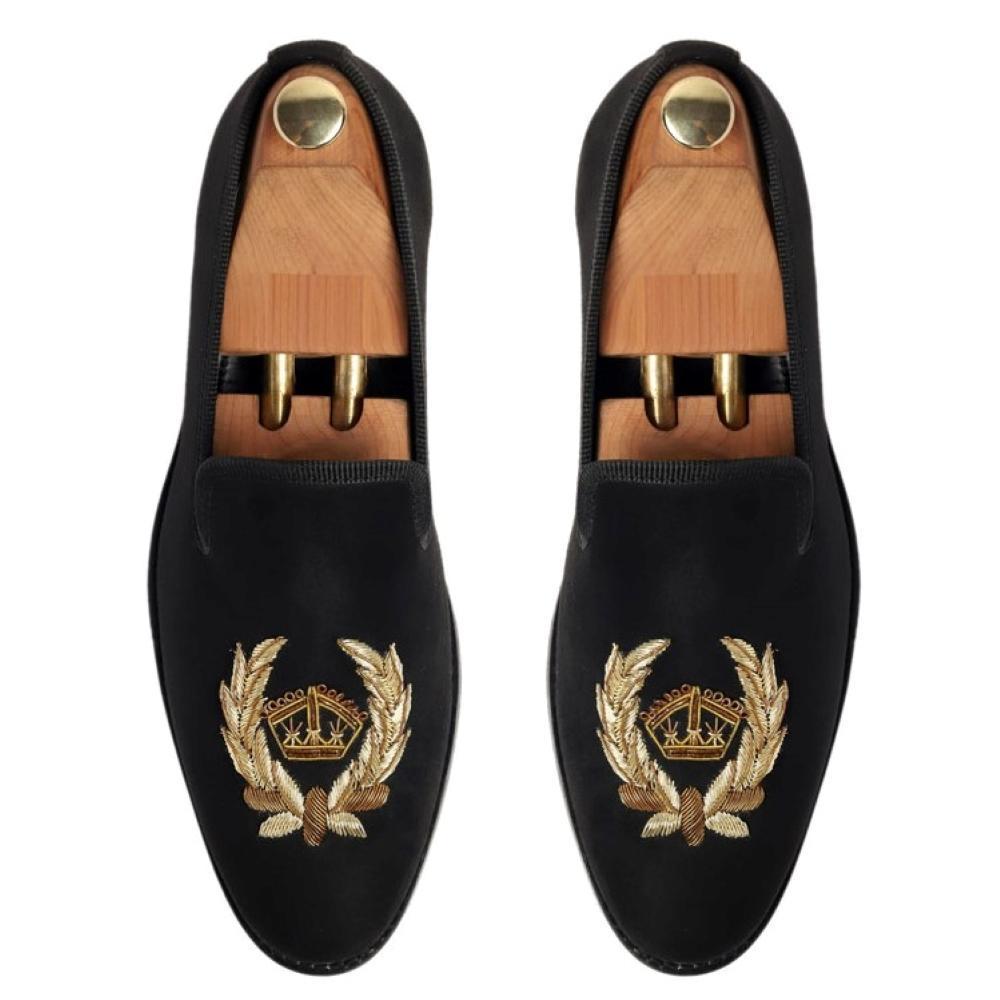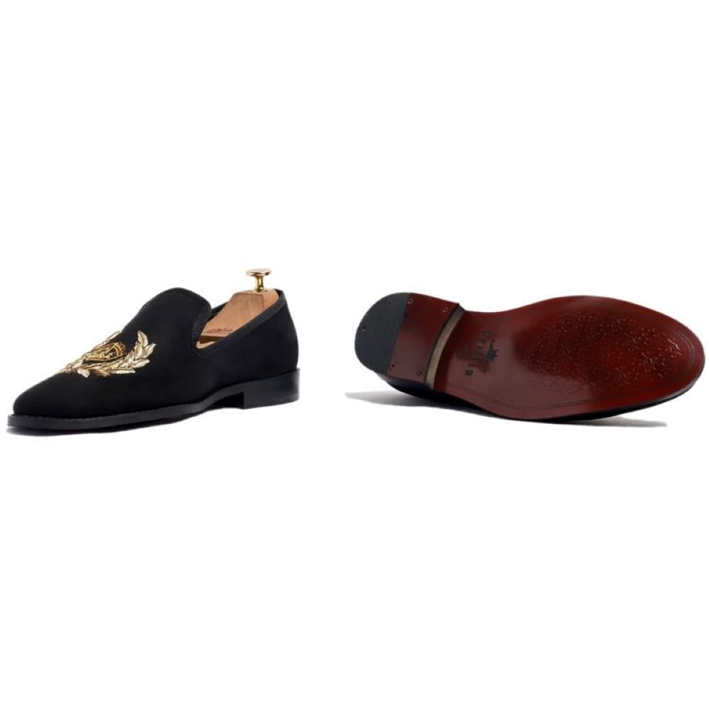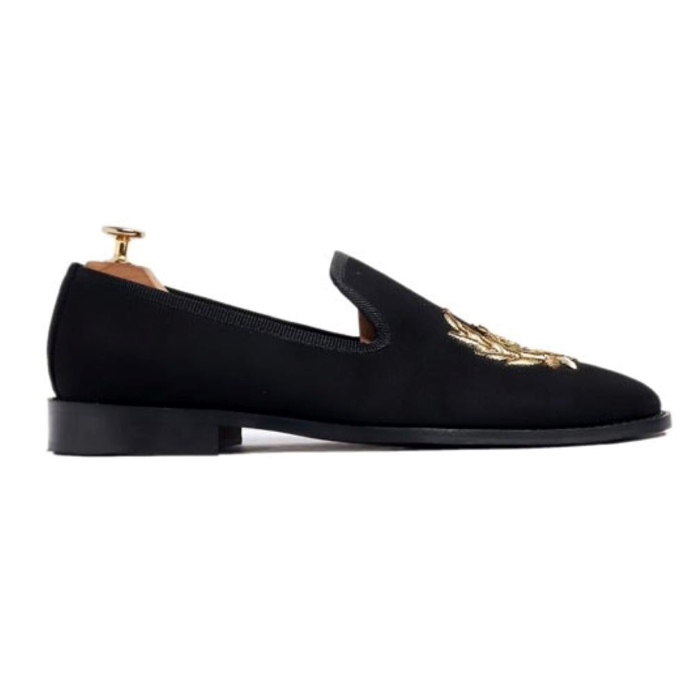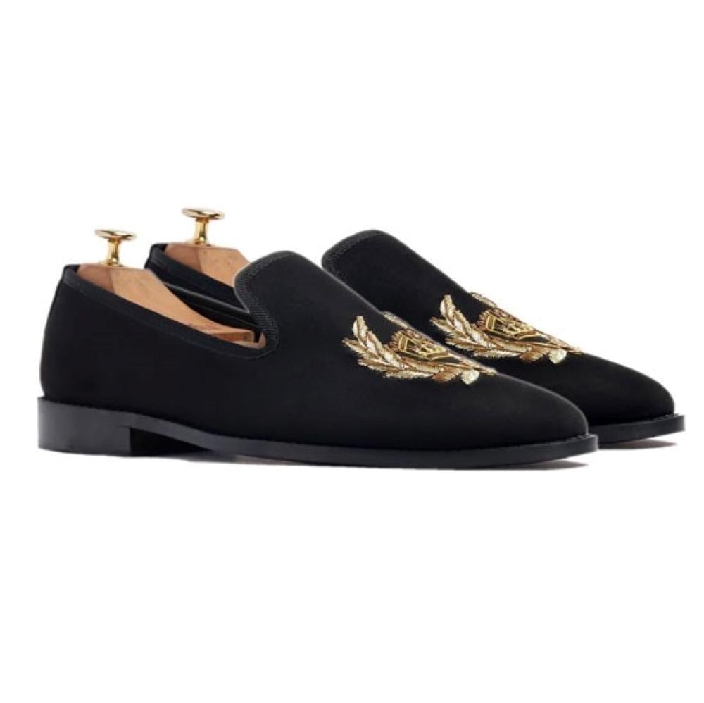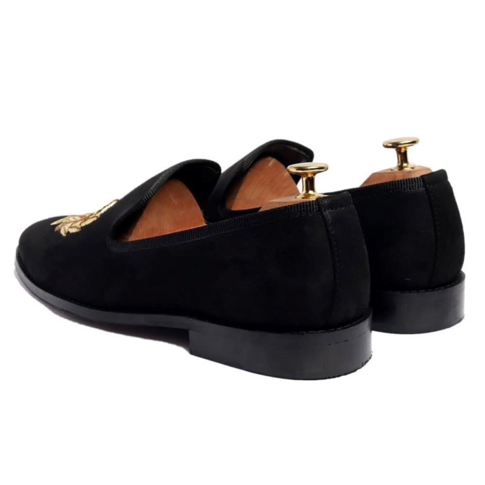 - Black Faux Leather Slip on comes with hand signature brass wire embroidery