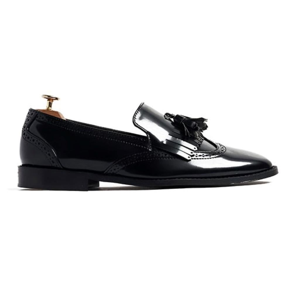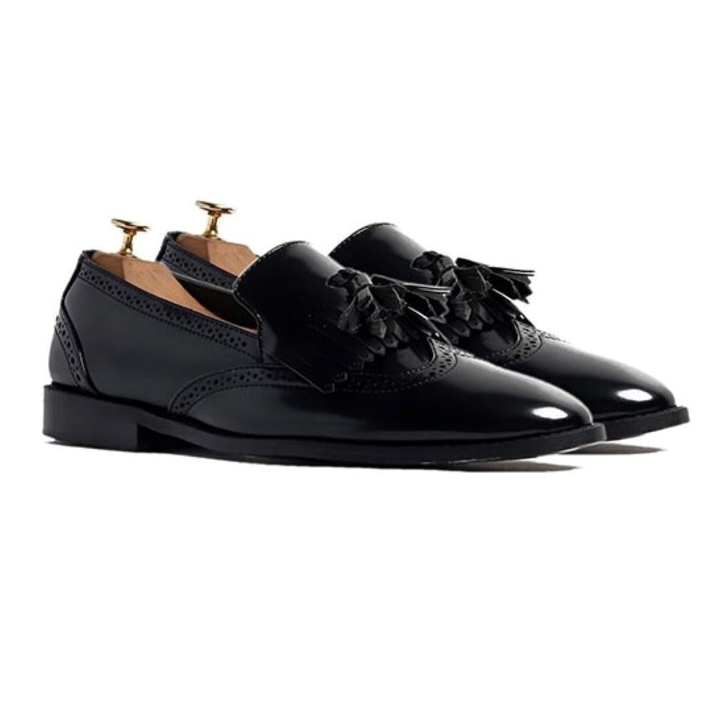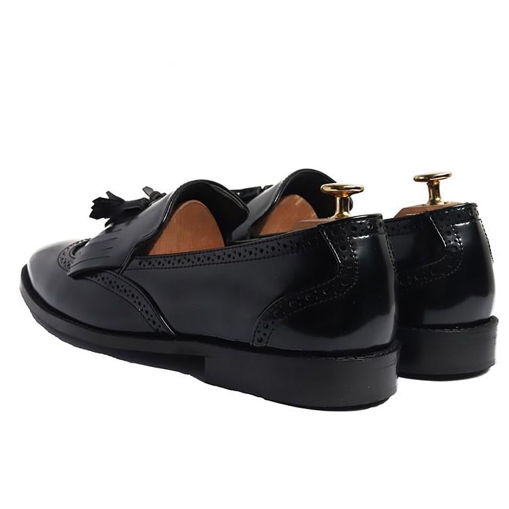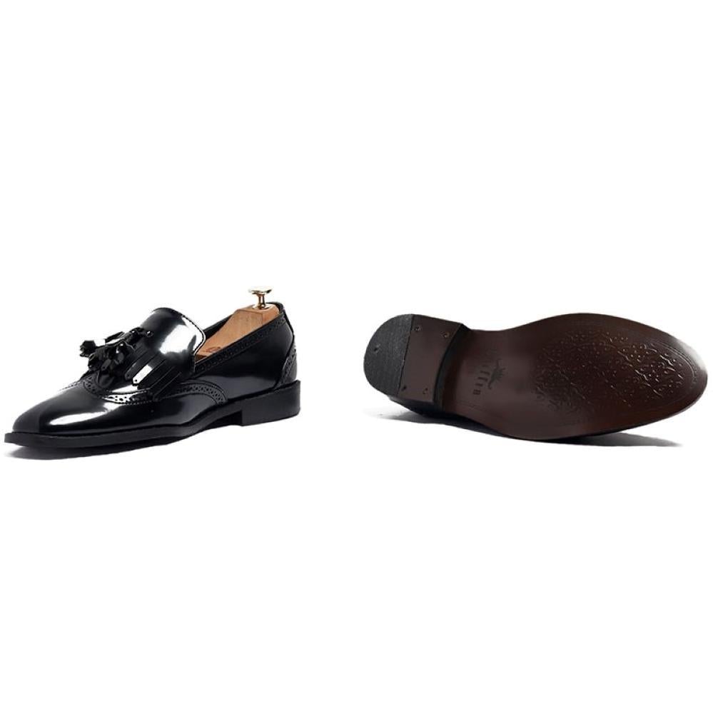 JET BLACK HAND-COLORED CALFSKIN LOAFERS WITH MATCHING BANDS, FRINGES AND TASSELS. THIS STYLE IS PART OF THE "CELEBRATE WITH GRIFFIN" CAPSULE COLLECTION, DESIGNED TOGETHER WITH WEDDING DESIGNER. IT'S ENRICHED BY THE EXCLUSIVE AND FULL MANUAL SHOE-COLORING TECHNIQUE 'TOLEDO GLAZE': AN ITALIAN CRAFTSMANSHIP PREROGATIVE AND UNMISTAKABLE SIGN OF UNIQUENESS. HANDCRAFTED AS PER VIGEVANO, ITALY, ACCORDING TO THE TRADITIONAL "A SACHET" TECHNIQUE WITH CALFSKIN LINING AND HANDCRAFTED LEATHER SOLES.