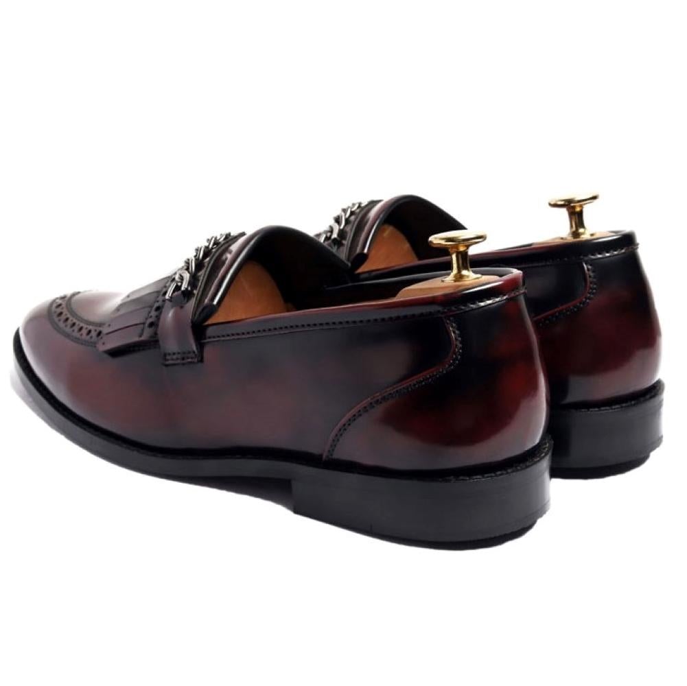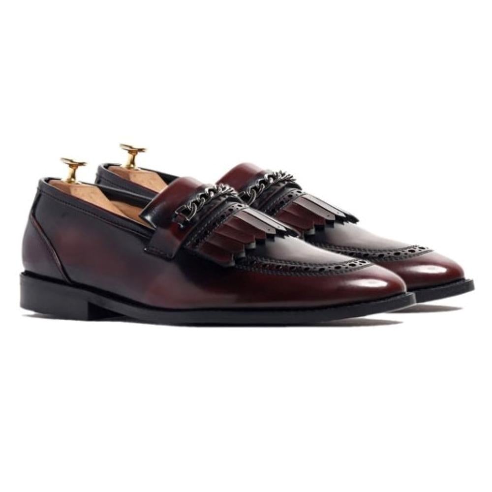 Style-TWO TONE BURNISHED PATENT FRINGES WITH CHAIN